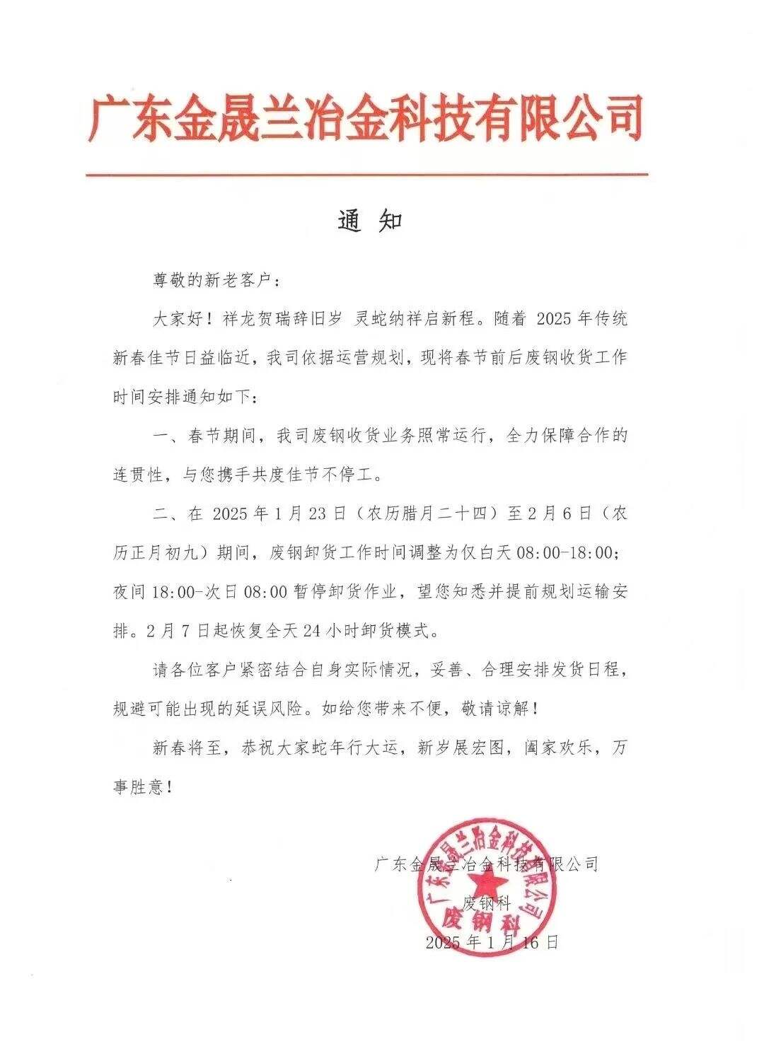 广东金晟兰冶金科技有限公司****年*月**日(农历腊月二十四)至*月*日(农历正月初九)期间,废钢卸货工作时间调整为仅白天 **:**-**:**;夜间 **:**-次日 **:**暂停卸货作业