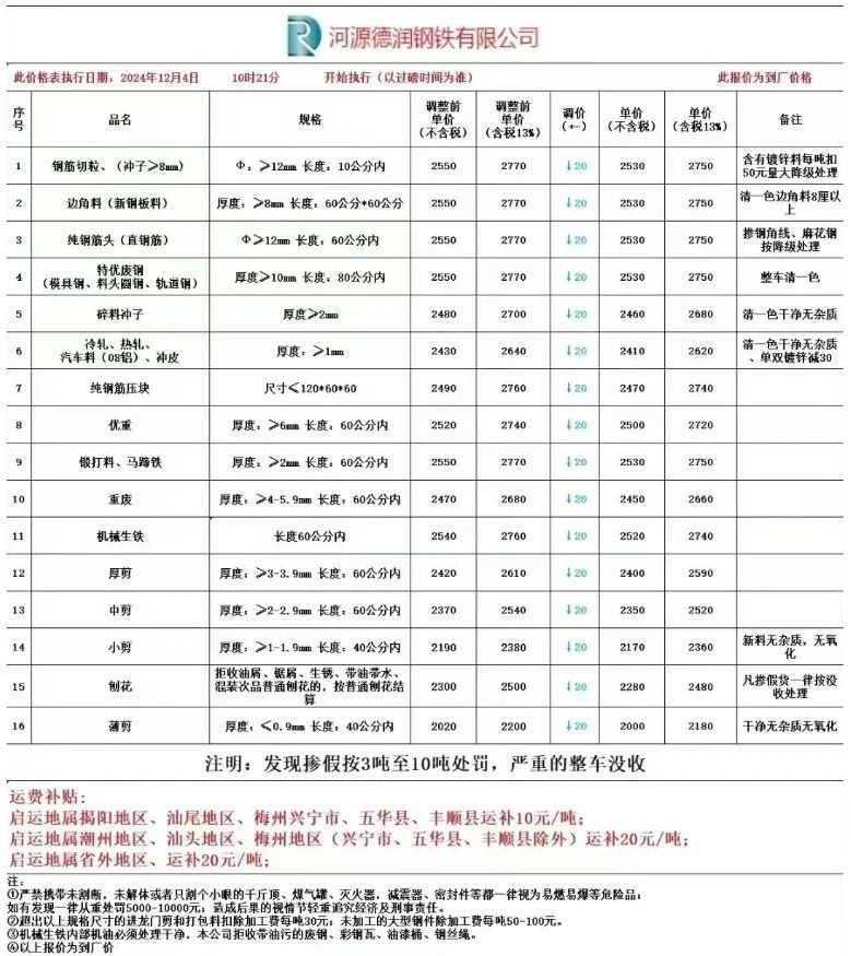 **月*日起,韶钢废钢部分下调**元/吨,具体价格以厂家价格表为准