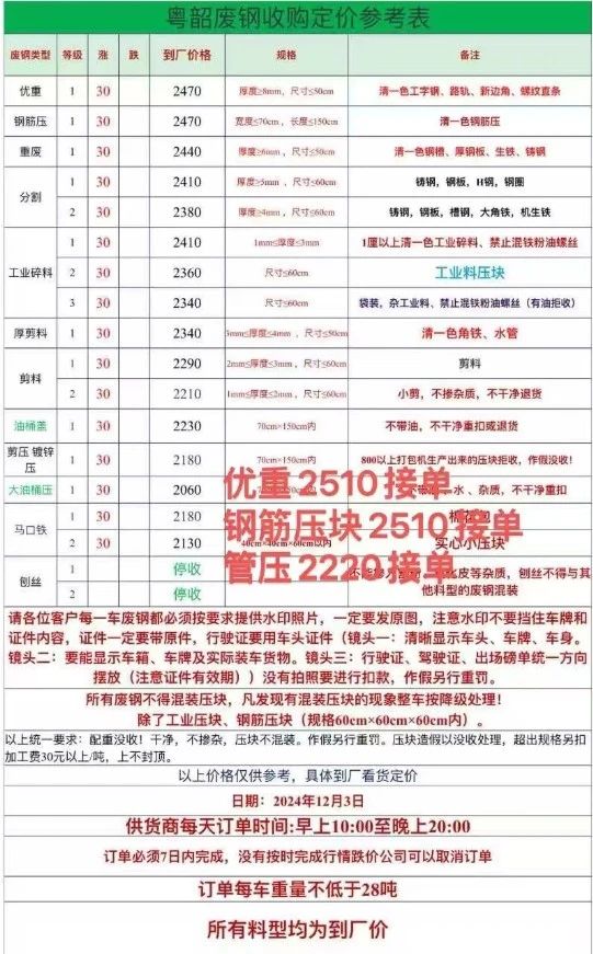 *日忠信华丰钢铁废钢跌**,优重****,重废****,风割料****,中剪****,刨花停收,小剪****,薄剪停收,自提,不含税,注禁止携带密封等危险品
