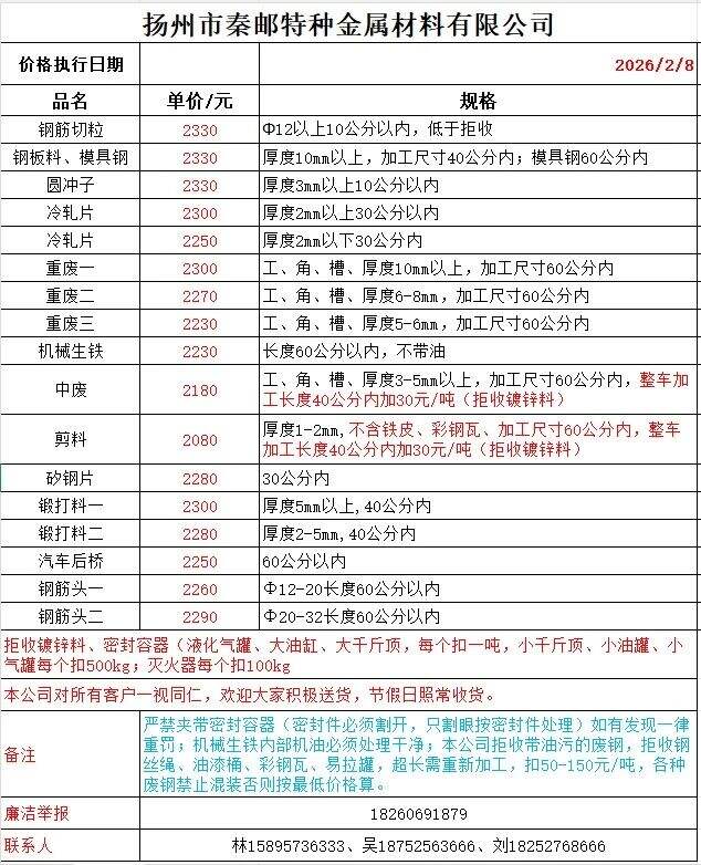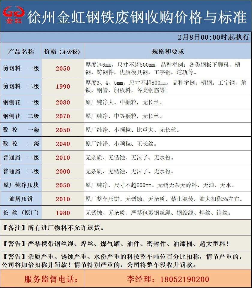 连云港亚新通知:*月*日**:**废钢价格下调**元/吨:一、**毫米厚新钢板料,模具钢,价****元;二、*毫米厚度以上锻打毛边,价****-****元;三、重废A,价****元;四、*毫米厚重废B,价****元;五、*毫米厚中废新料,价****-****元。*毫米厚度以下拒收,车面与车底等级不一,按掺假处理。规格:**X**。超长度需重新加工:(*)占**%以上扣**元/吨(*)占**%以上扣***元/吨(*)化工厂料,带油料,高硫废钢,油漆桶废钢一律拒收。所有密封容器(如:千斤顶,汽车液压顶,各类气瓶,罐,密封管件等),必须彻底切断处理,如未彻底切断,重罚*****元以上/件。