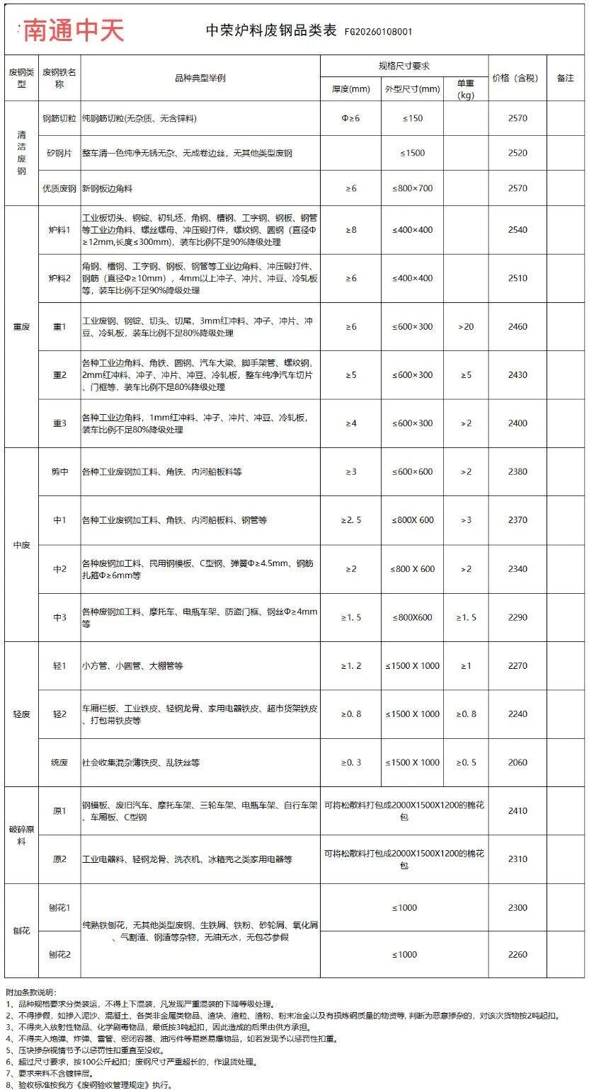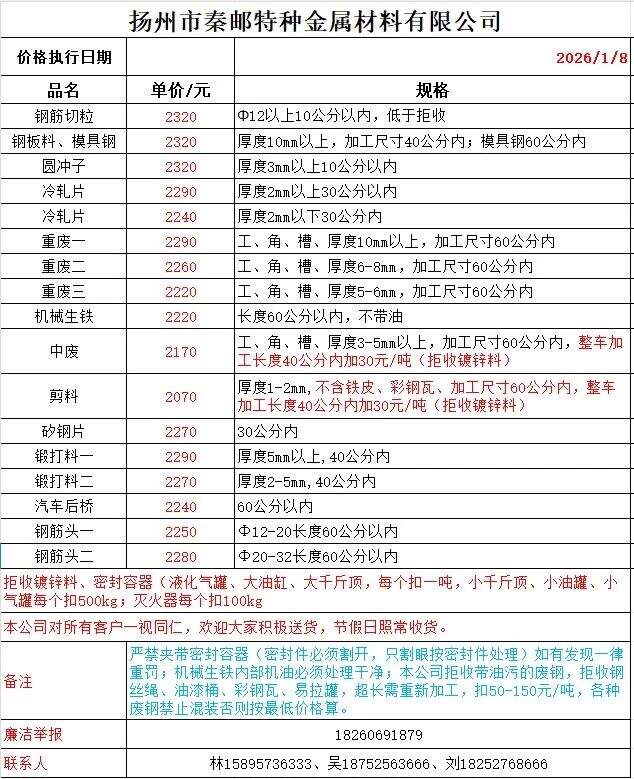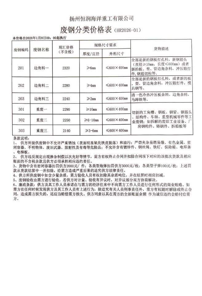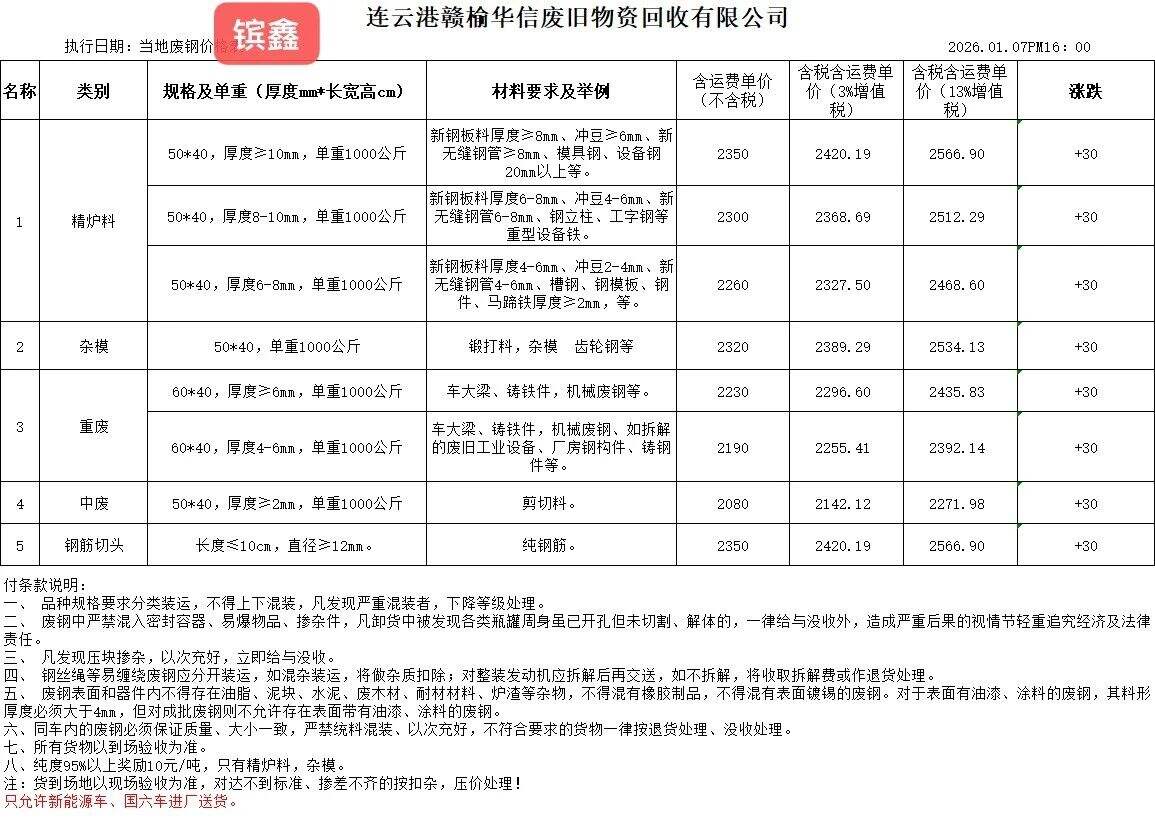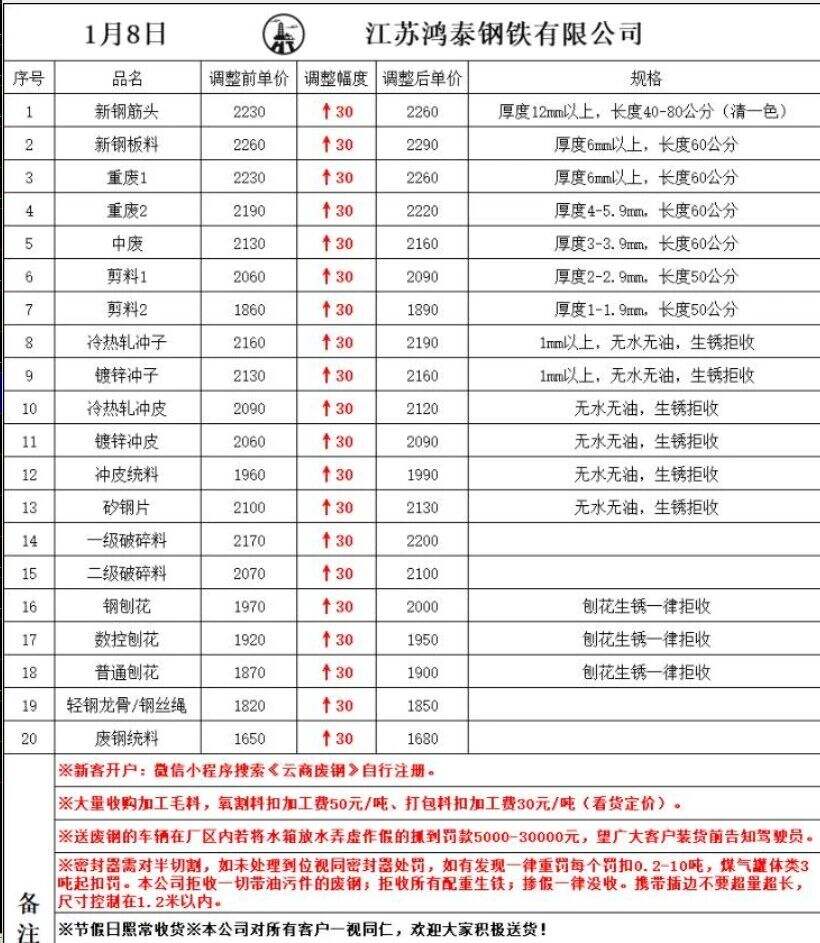 更新:连云港亚新通知:*月*日废钢价格上调**元/吨:一、**毫米厚新钢板料,模具钢,价****元;二、*毫米厚度以上锻打毛边,价****-****元;三、重废A,价****元;四、*毫米厚重废B,价****元;五、*毫米厚中废新料,价****-****元。*毫米厚度以下拒收,车面与车底等级不一,按掺假处理。规格:**X**。超长度需重新加工:(*)占**%以上扣**元/吨(*)占**%以上扣***元/吨(*)化工厂料,带油料,高硫废钢,油漆桶废钢一律拒收。所有密封容器(如:千斤顶,汽车液压顶,各类气瓶,罐,密封管件等),必须彻底切断处理,如未彻底切断,重罚*****元以上/件。