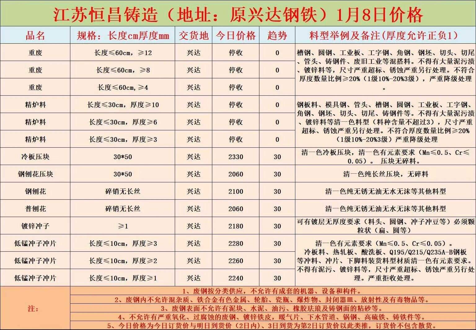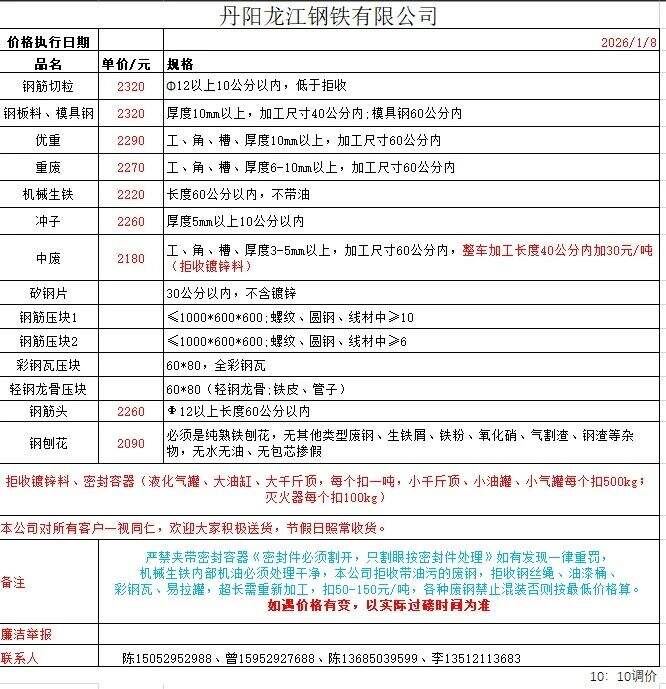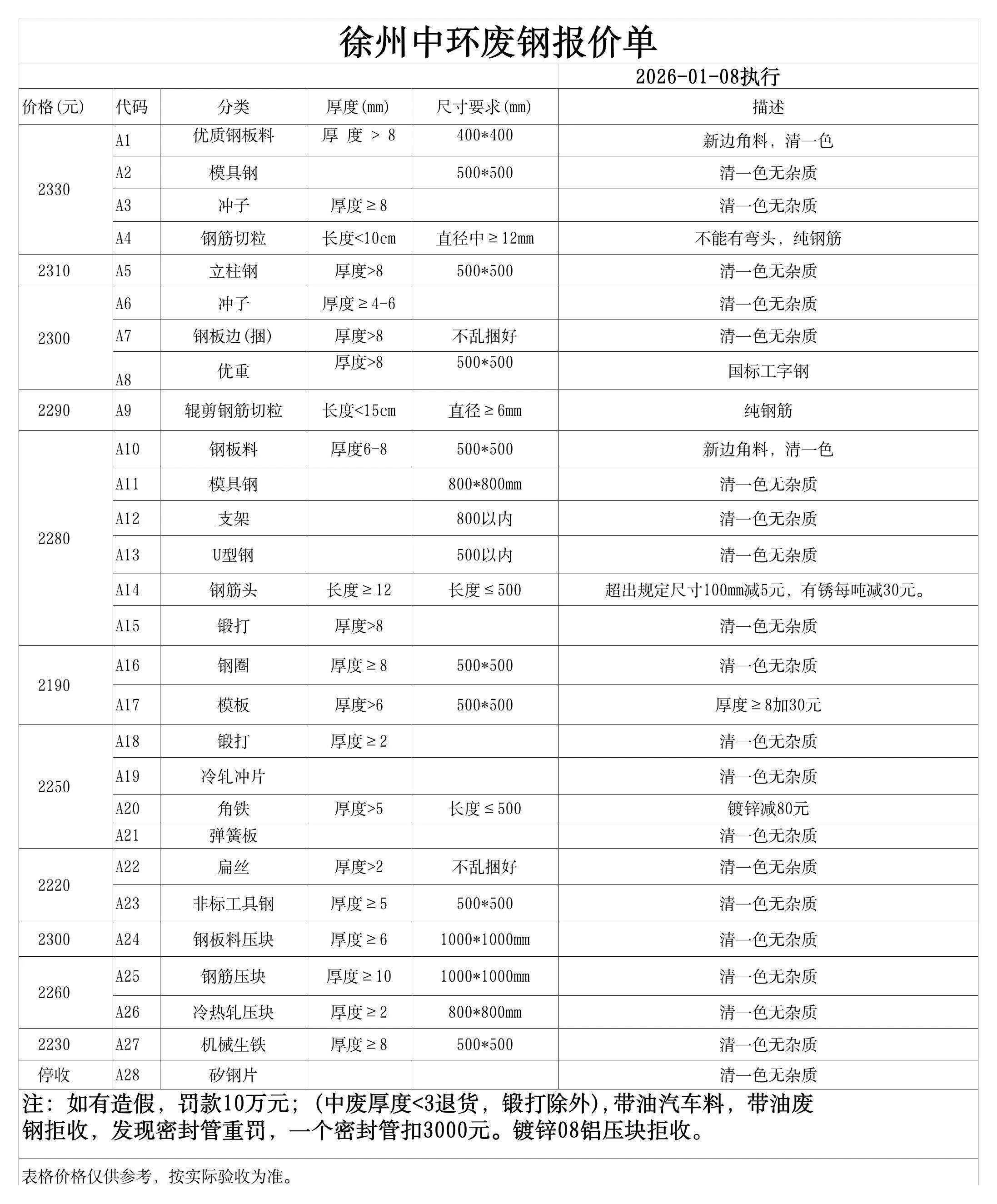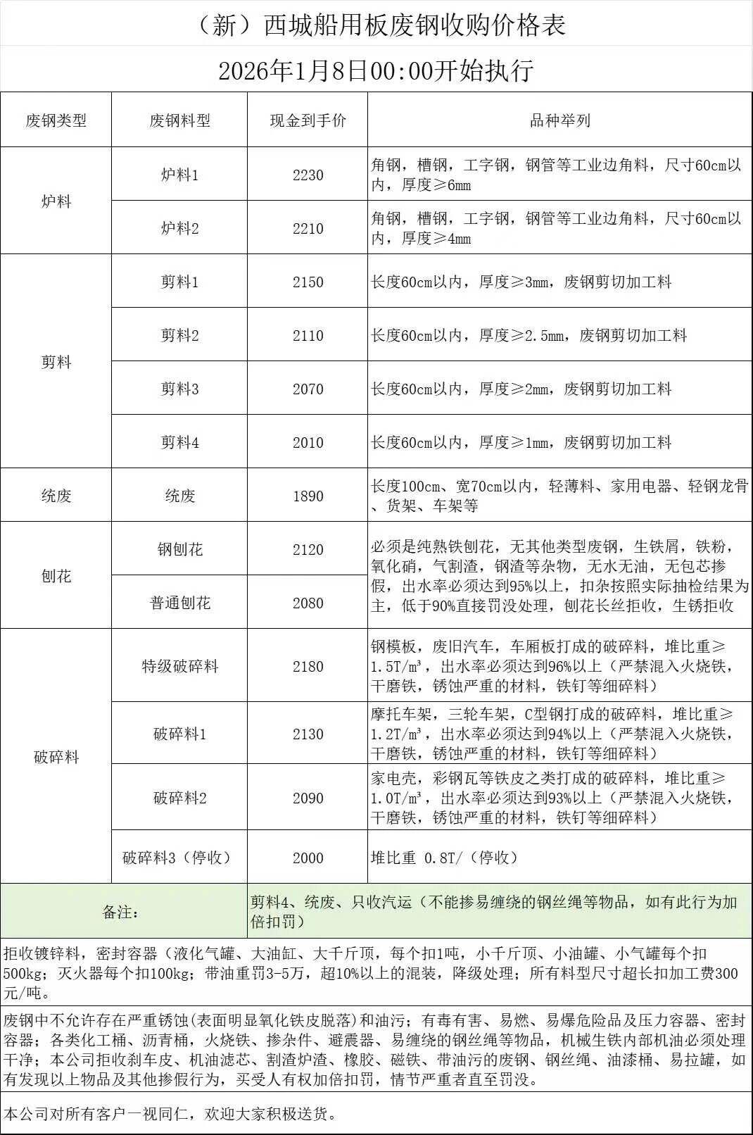 更新:连云港亚新通知:*月*日废钢价格上调**元/吨:一、**毫米厚新钢板料,模具钢,价****元;二、*毫米厚度以上锻打毛边,价****-****元;三、重废A,价****元;四、*毫米厚重废B,价****元;五、*毫米厚中废新料,价****-****元。*毫米厚度以下拒收,车面与车底等级不一,按掺假处理。规格:**X**。超长度需重新加工:(*)占**%以上扣**元/吨(*)占**%以上扣***元/吨(*)化工厂料,带油料,高硫废钢,油漆桶废钢一律拒收。所有密封容器(如:千斤顶,汽车液压顶,各类气瓶,罐,密封管件等),必须彻底切断处理,如未彻底切断,重罚*****元以上/件。