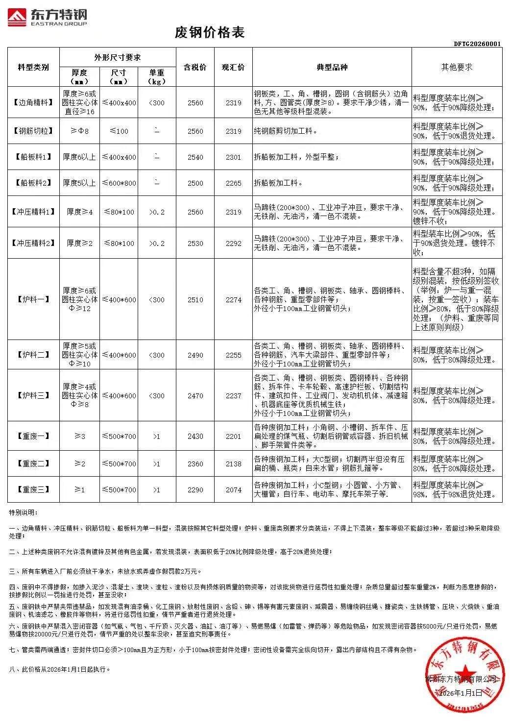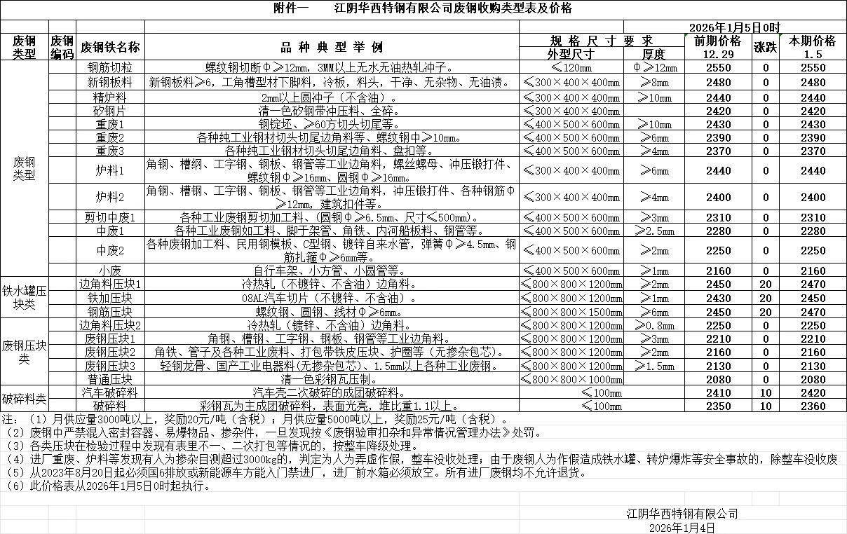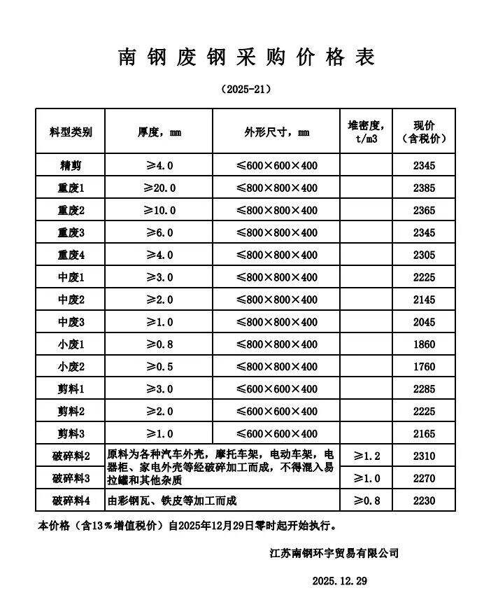 江苏敬业基地计划于****年*月*日*时起含税价格:统一上调**元/吨。钢板料(*mm)****元/吨,重废一(**mm)****元/吨,重废二(*mm)****元/吨,重废三(*mm)****元/吨,次重废(*mm)****元/吨,特级破碎料*类****元/吨。