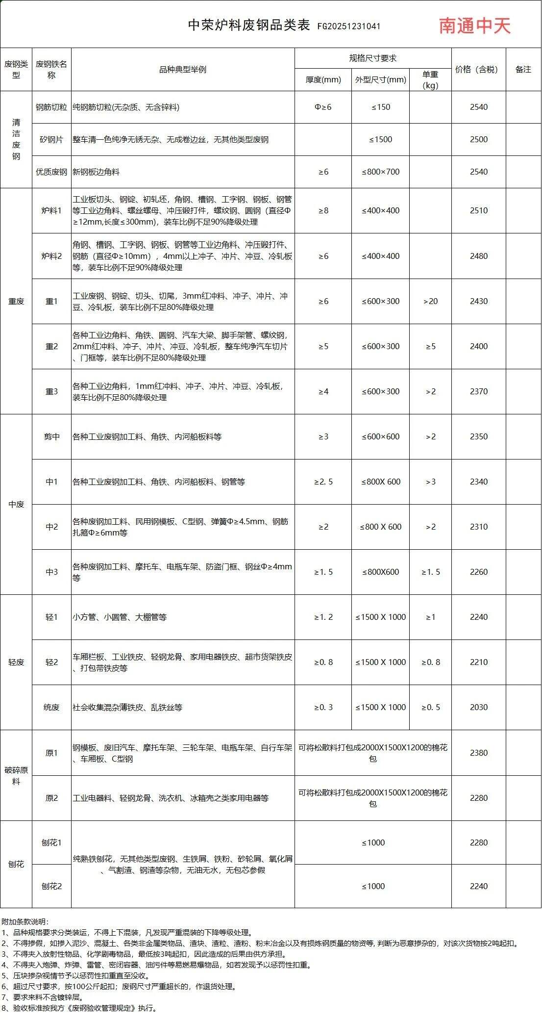 南通中天****年**月**日起,刨花下调**元/吨,重废、中轻废、破碎原料下调**元/吨,其他品类不变