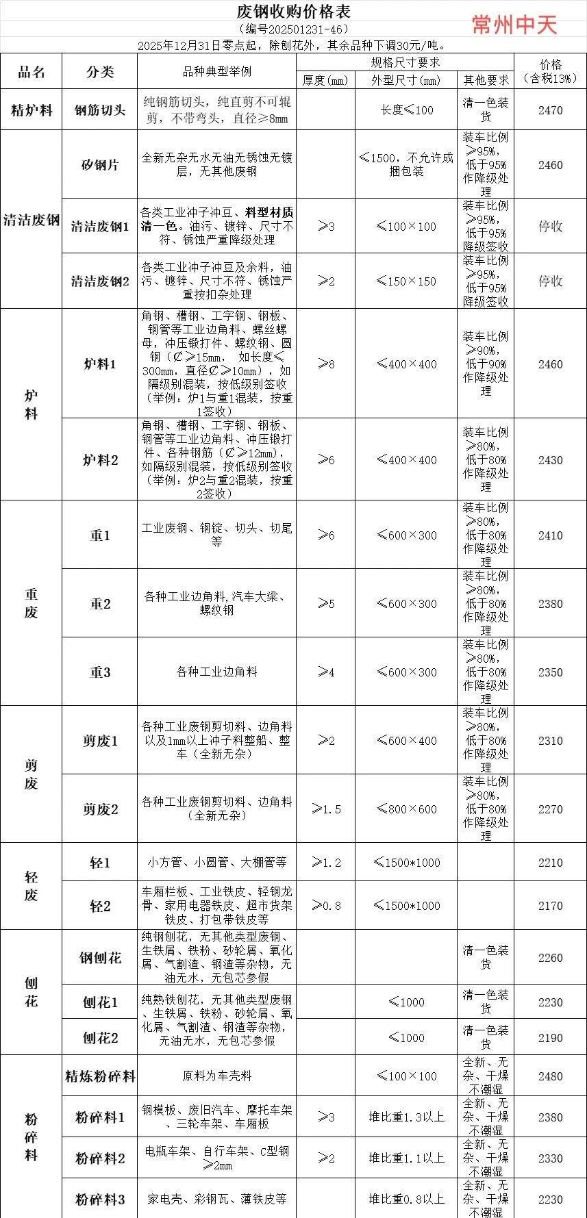 常州中天废钢价格调整:除刨花外