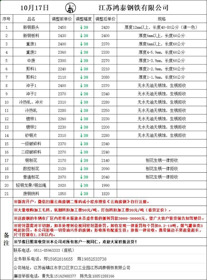 镇江鸿泰统一下调**元,具体价格以厂家价格表为准.,**日镇江鸿泰,新钢筋头****,新钢板料****,重废*,****,重废*,****,中废****,剪料*,****,剪料*,****,冲子*,****,冲子*,****,冷热轧、冲片****,冷热轧****,镀锌*,****,镀锌*,****,矽钢片****,一级破碎料****,二级破碎料****,钢刨花****,数控刨花****,普通刨花****,轻钢龙骨/钢丝绳****,废钢统料****不含税