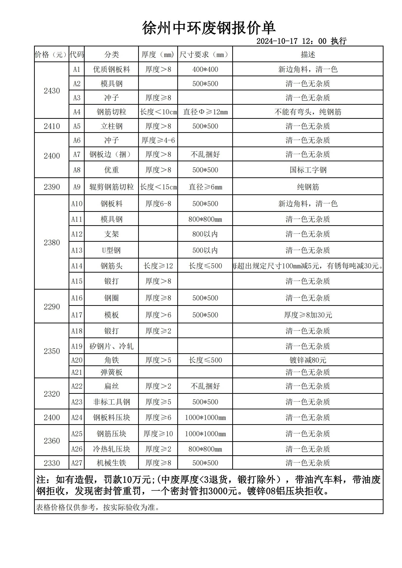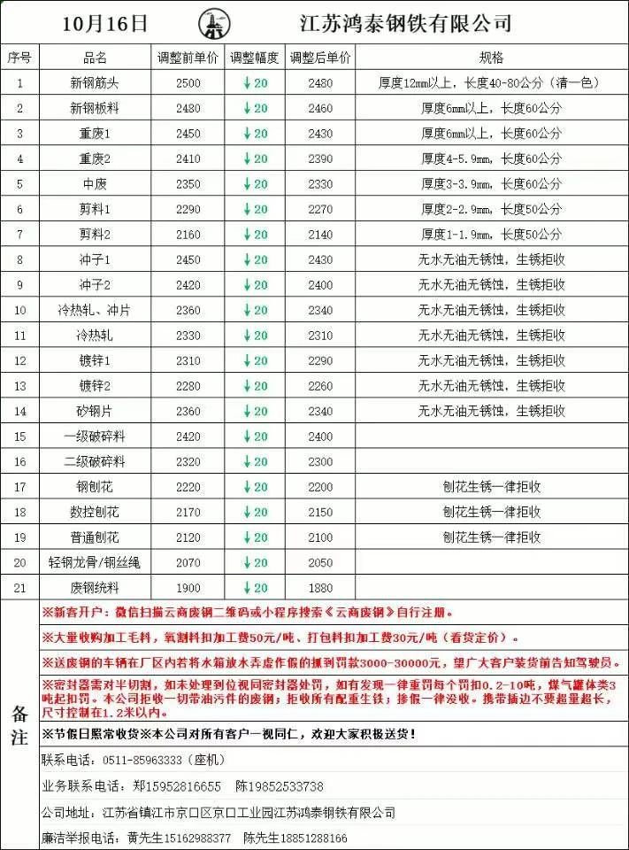 连云港亚新通知:**月**日废钢价格下调**元/吨:一、钢板料,模具钢,价****元,二、重废A,价****元,三、*毫米厚重废B,价****元,四、*毫米厚中废新料,价****-****元,*毫米厚度以下拒收,车面与车底等级不一,按掺假处理,规格,**X**,超长度需重新加工,(*)占**%以上扣**元/吨,(*)占**%以上扣***元/吨,(*)化工厂料,带油料,高硫废钢,油漆桶废钢一律拒收,所有密封容器(如,千斤顶,汽车液压顶,各类气瓶,罐,密封管件等),必须彻底切断处理,如未彻底切断,重罚*****元以上/件
