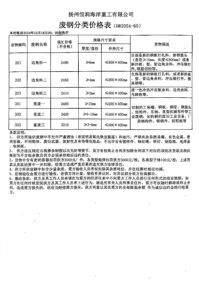 **日扬州恒润海洋重工最新跌**:边角料一****,边角料二****,边角料三****,重废一****,重废二****,重废三****不含税