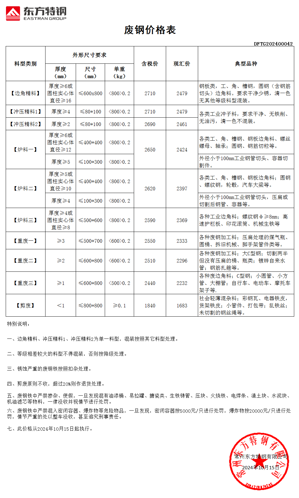 **日华航特钢。下调**元生铁:****元。优重*以上:****-****元。重废*-*:****元中废*-*:****元剪料-:****元钢刨花:****元数控刨花:****元普通刨:****元所有尺寸加工**公分以内。密封管一个罚款****元,发现掺假按*吨至**吨处罚严重的整车没收。