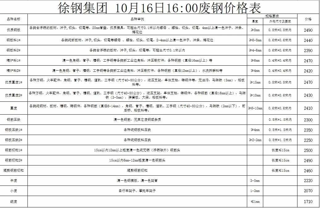 徐钢集团**月**日**:**开始废钢下调**价格,调整后,优质钢板****,钢板料*.****,精炉料*.****,优质重废*.****,重废****,钢筋压块****,钢板压块*.****,钢筋切粒*.****,中废****,小废****,统废****.详见价格表。魏经理*********** 微信同号:****-********转***