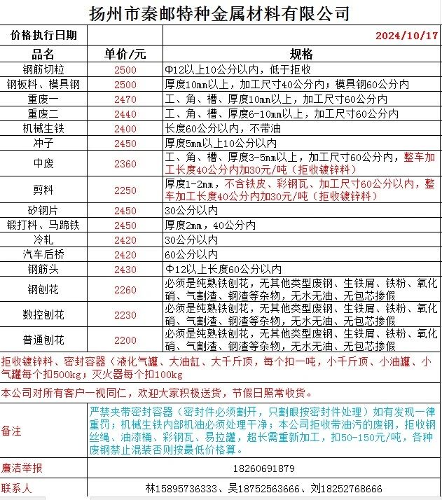 **日扬州秦邮跌**:钢筋切粒****,钢板料、模具钢****,重废一****,重废二****,机械生铁****,冲子****,中废****,剪料****,矽钢片****,锻打料、马蹄铁****,冷轧****,汽车后桥****,钢筋头****,钢刨花****,数控刨花****普通刨花****.不含税