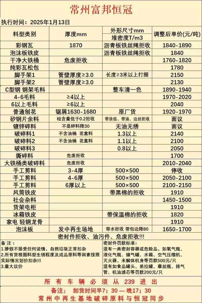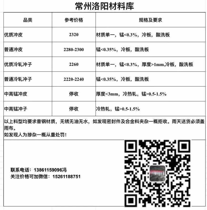 洛阳材料库高价收购、自提冷板冲皮,钢板料。收购价:优质冷板酸洗冲条冲皮最高****,普通低锰冷板酸洗冲条冲皮****-****,低碳低锰冲子****-****,中高锰冷热混打包料停收,中高锰冷热冲子停收,联系电话***********冯,关注最新价格请加微信:***********。地址:江苏常州武进洛阳镇创盛路*号