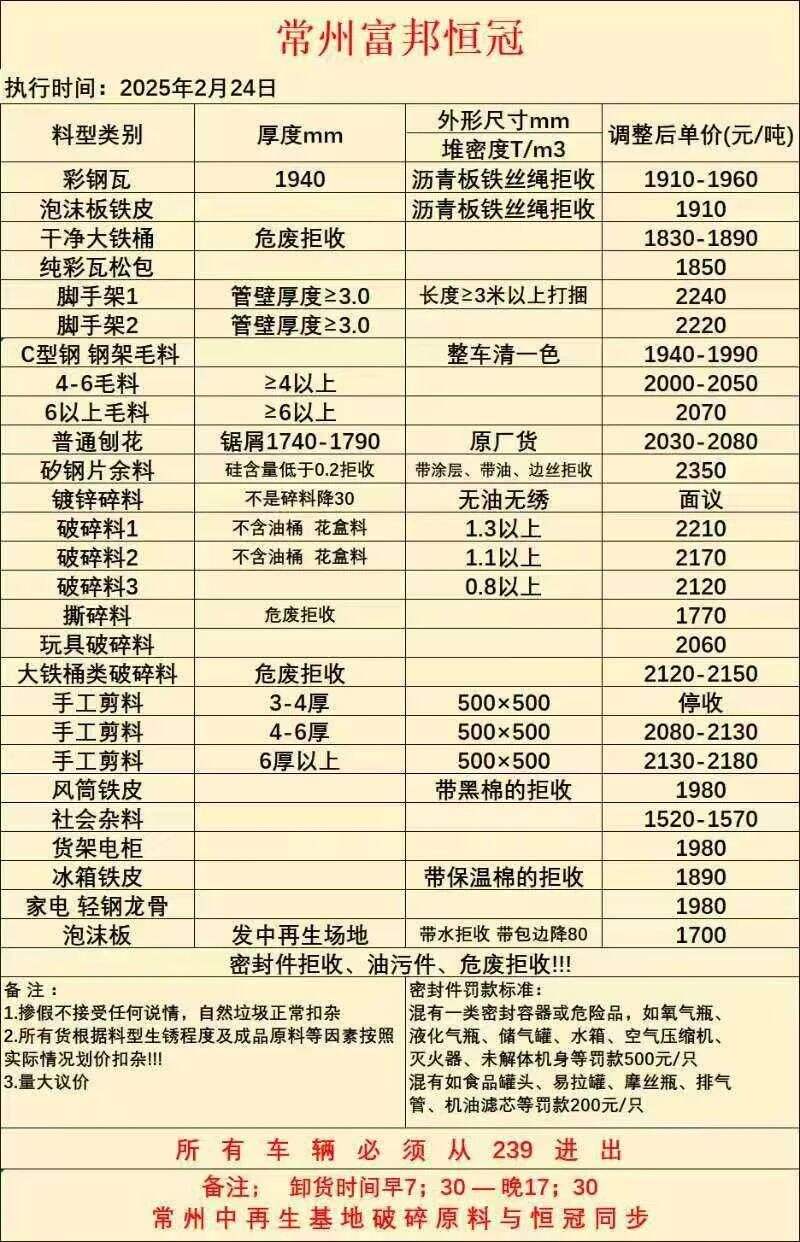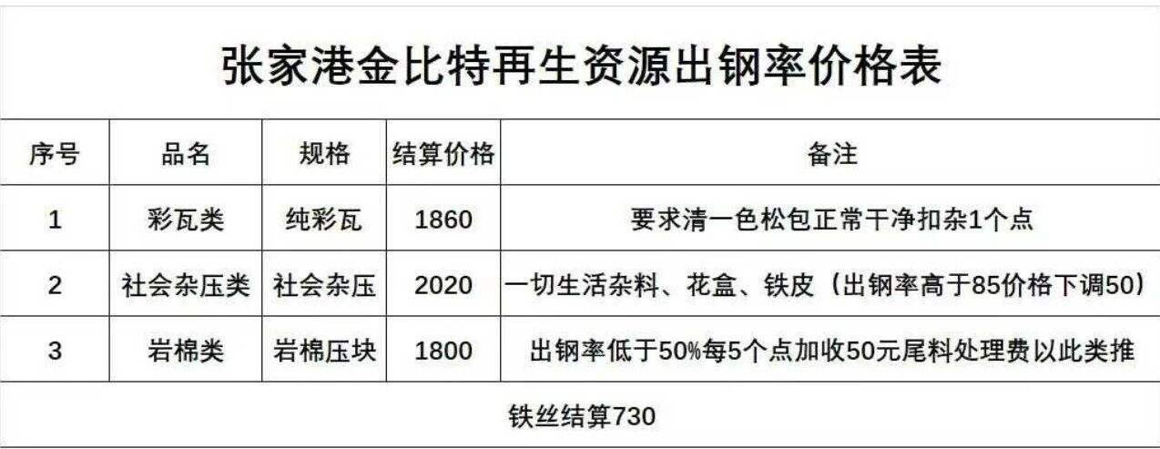 ****年*月**日张家港金比特再生资源出钢率价格表
