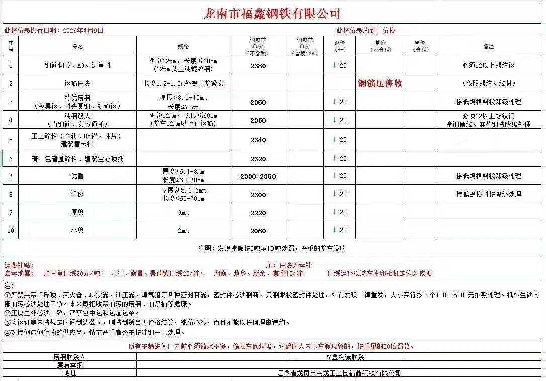 江西九钢:自****年*月*起:汽运:钢筋压块、边角料压块*、冷热轧镀锌压块*上涨**元/吨;边角料压块*、冷热轧镀锌压块*、一级废钢压块A、汽车轮胎钢丝上涨**元/吨;二级废钢压块涨**元/吨,其他料型不变。船运:热压钢块上涨**元/吨,其他料型不变。