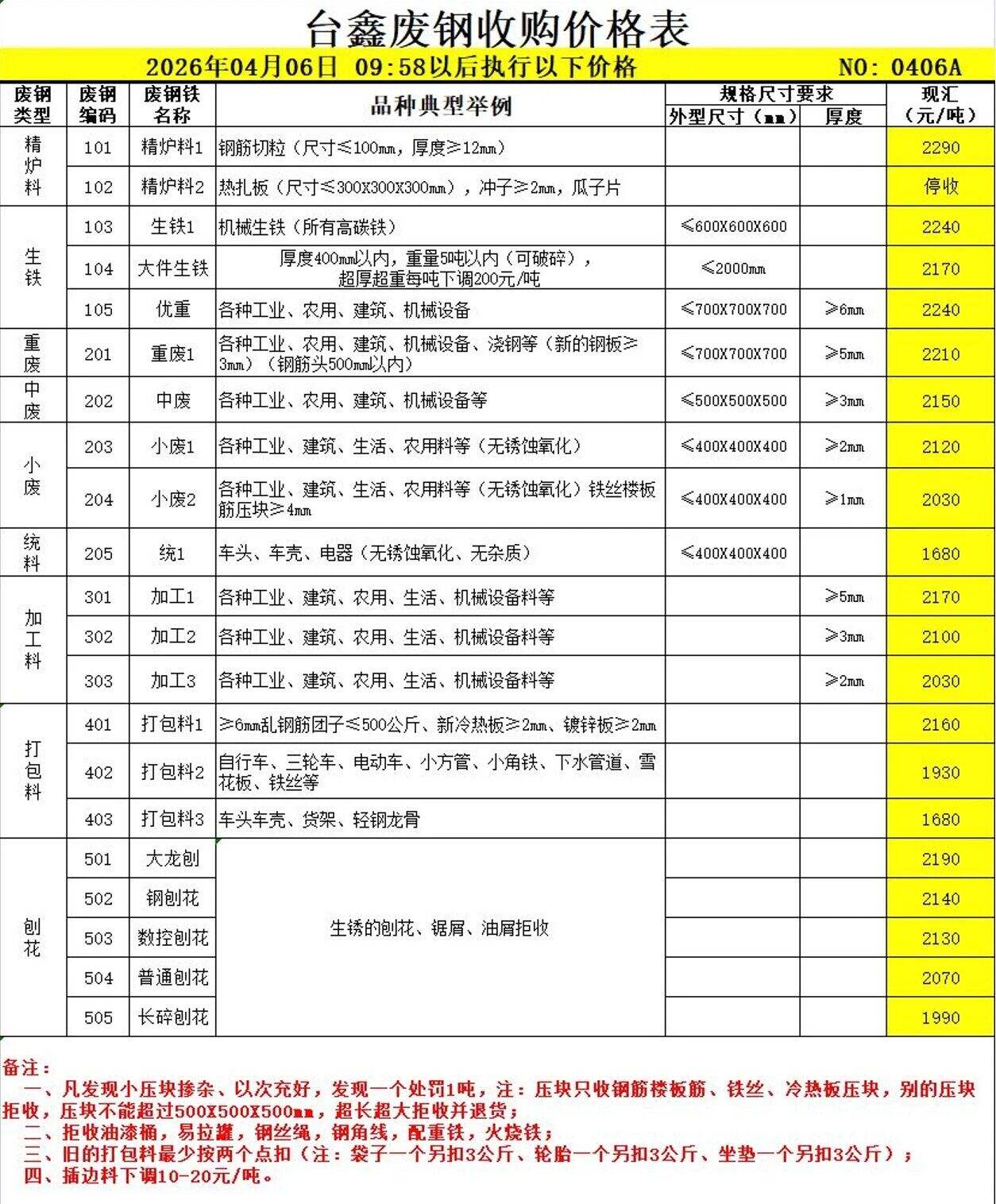 江西萍钢各废钢供货商:从*月*日起,散料废钢、钢筋压块、脚手架管压块、破碎料、一类压块、二类压块、二类压块(小块)、三类压块、四类压块下调**元/吨,五类压块下调**元/吨,其他品种不变。收到请回复。