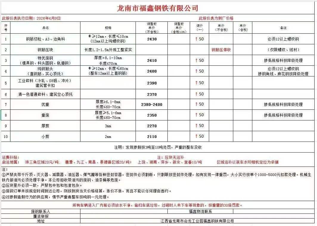 ****年*月*日江西龙南福鑫废钢价格上调**元/吨