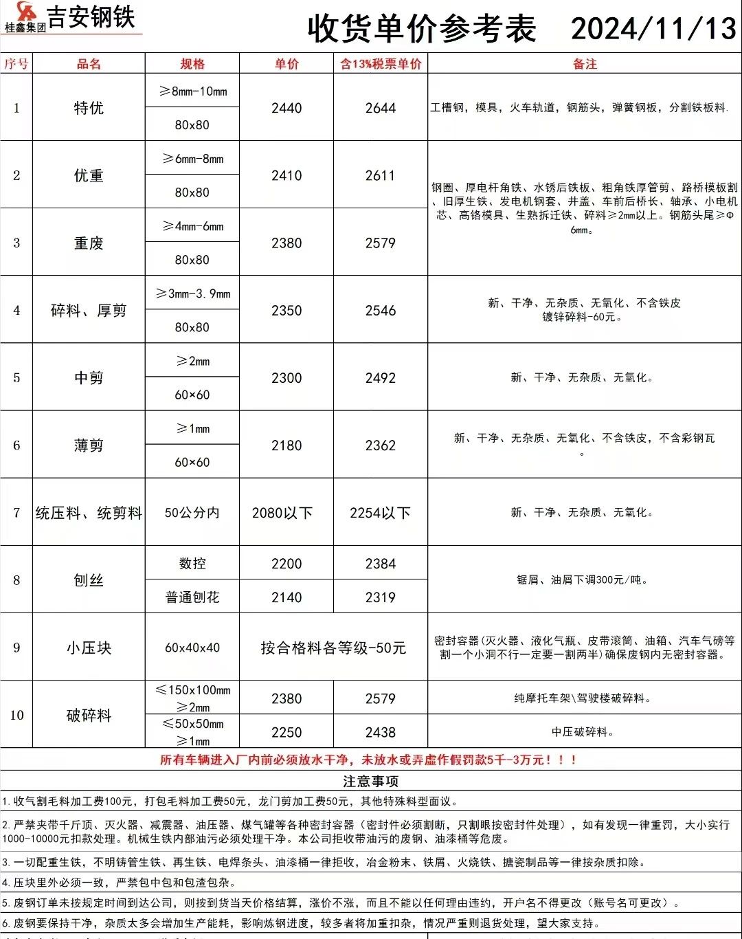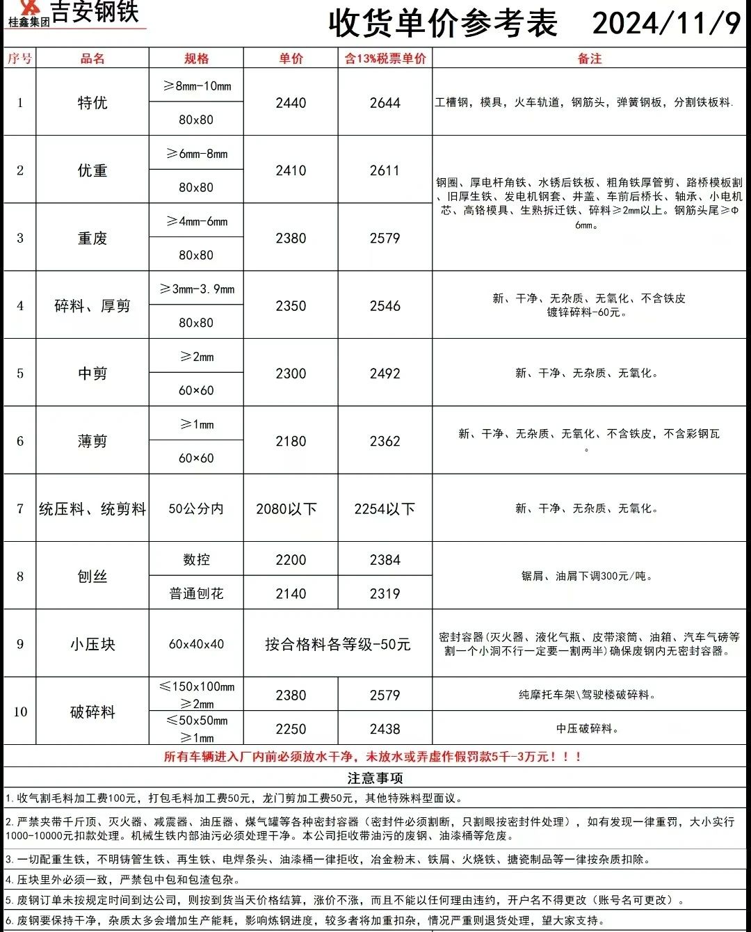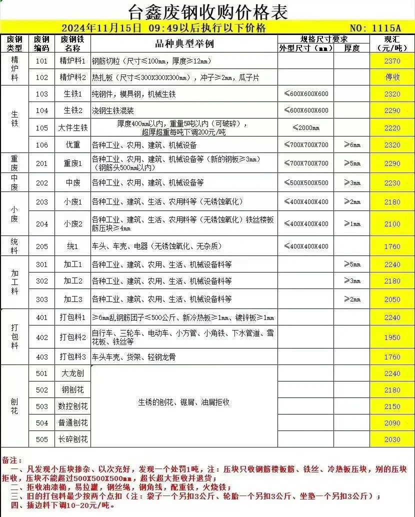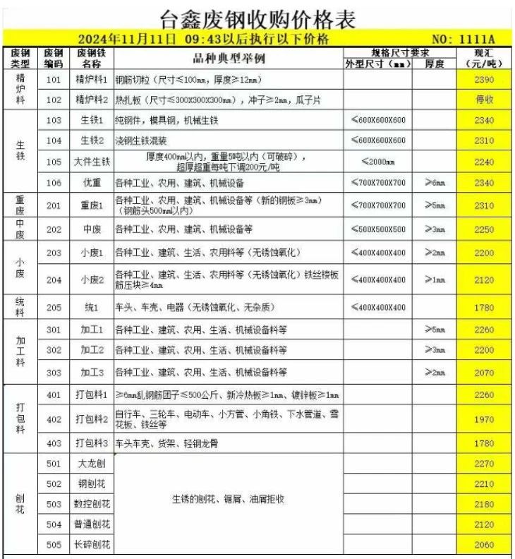 台鑫通知,**月**日*点**分起,门面所有刨花下调**元,其他料型下调**元、外调所有刨花下调**元,其他料型下调**元、驻外场地所有料型下调**元,,精炉料一****,生铁****-****,优重****,重废一****中废****,小废****-****,统料****,打包料****-****,钢刨****,普通刨花****,不含税.