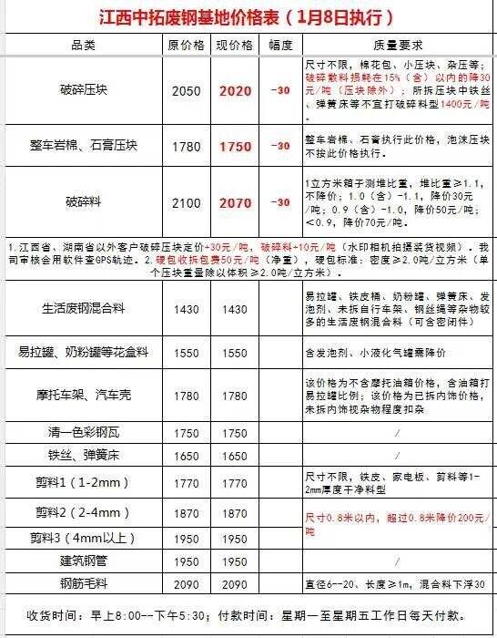 调价通知:*月*日,江西中拓基地破碎压块和破碎料跌**元每吨。