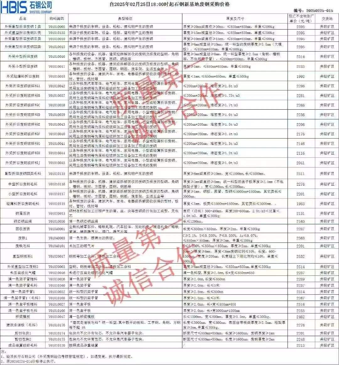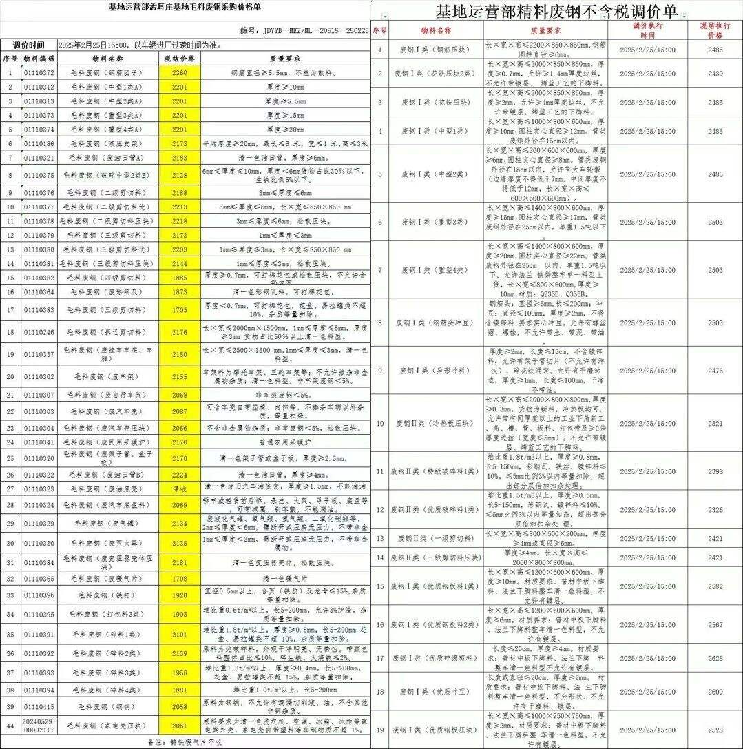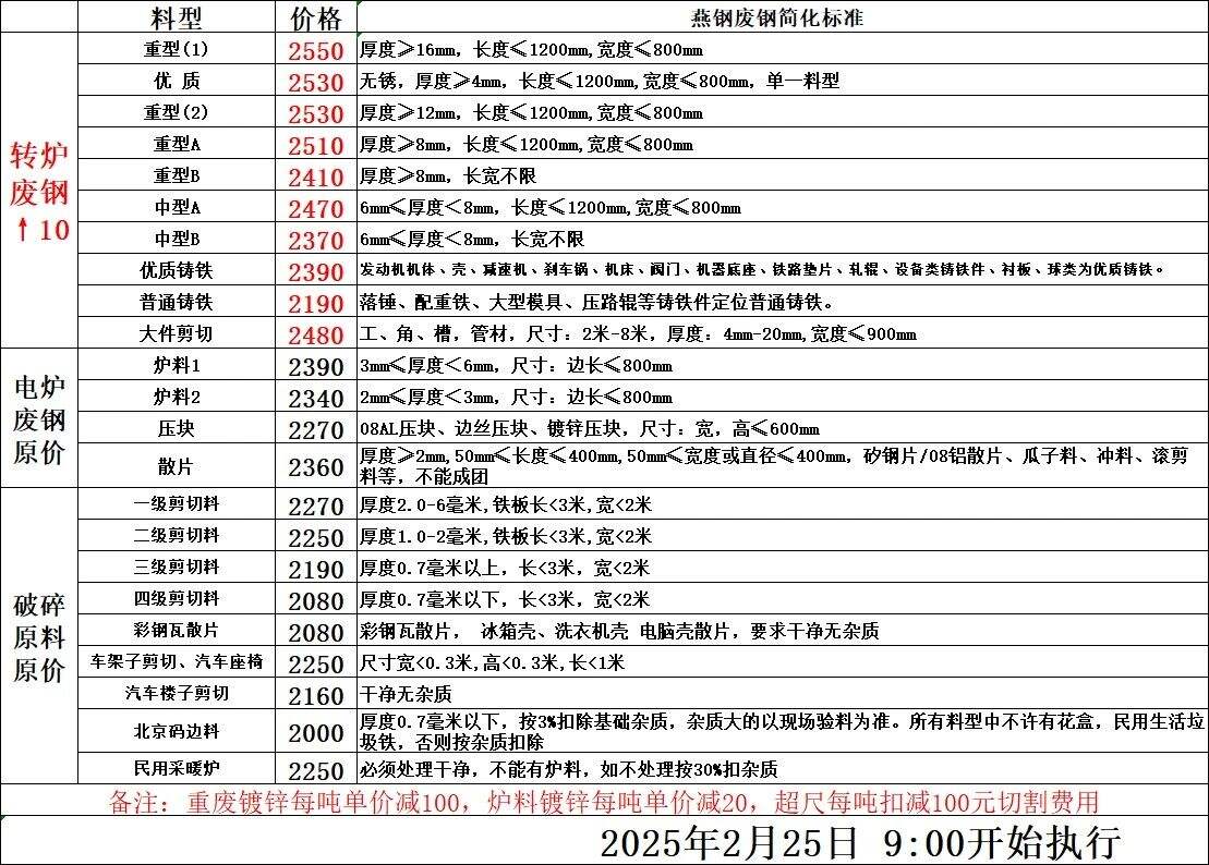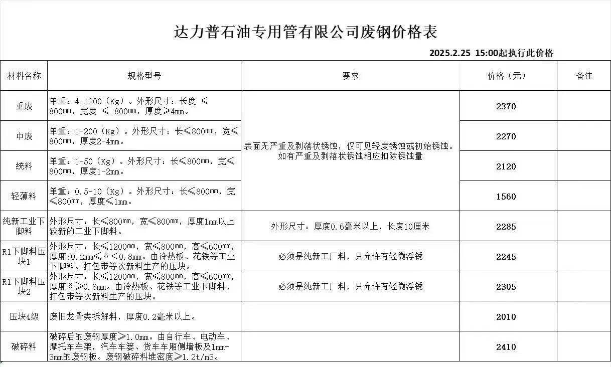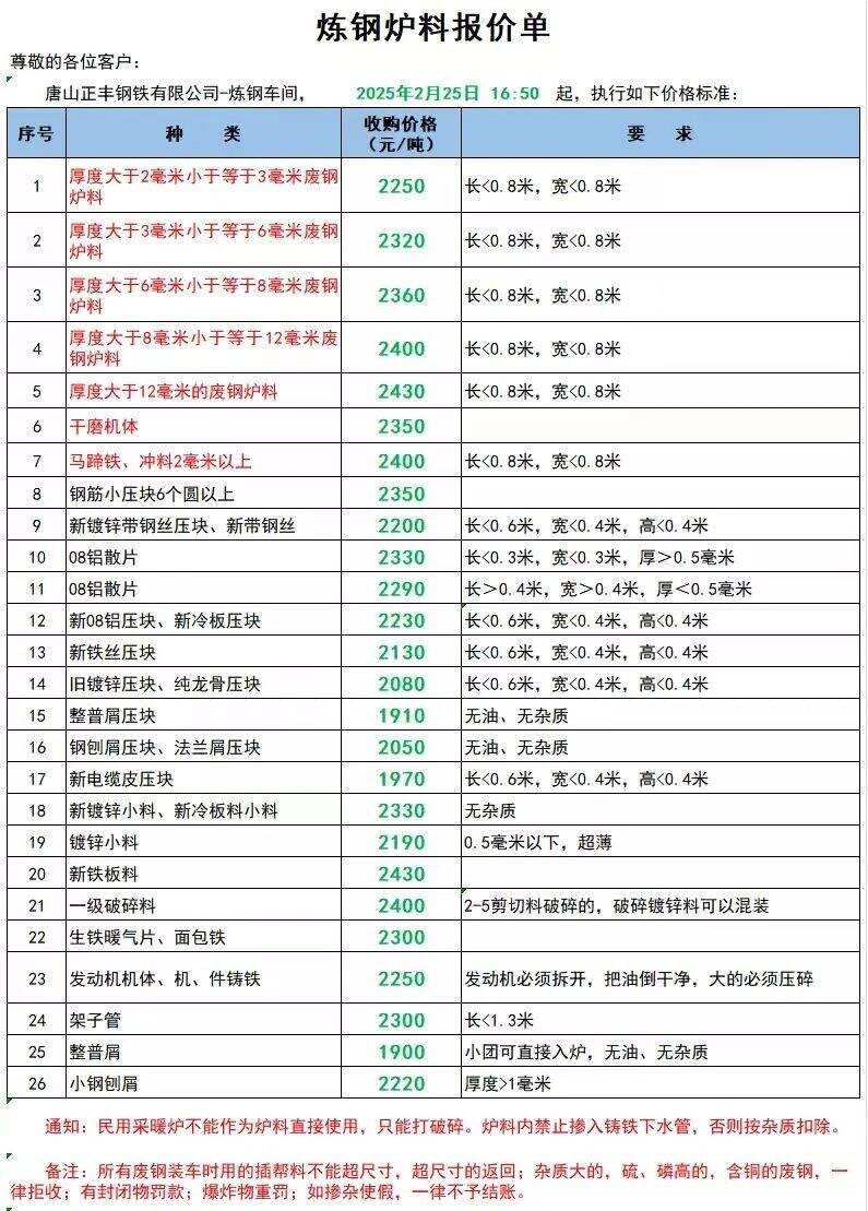 废钢收购价格调整通知,各位铁户,****年*月**日**:**起,正丰钢铁所有厂区下调**元/吨,正丰炼钢车间,废钢*-*厚****,*-*厚****,*厚以上****,*厚以上****,钢筋小压块****新带钢丝****新冷板压块****新铁丝压块****镀锌小料****一级破碎料****整普销****,生铁暖气片、面包铁****,发动机机体****,破碎车间最新价,一级破碎剪切****二级破碎剪切****,*级破碎剪切****四级破碎剪切****彩钢瓦打散片****自行车小压块****、汽车篓子小压块****摩托车架子****