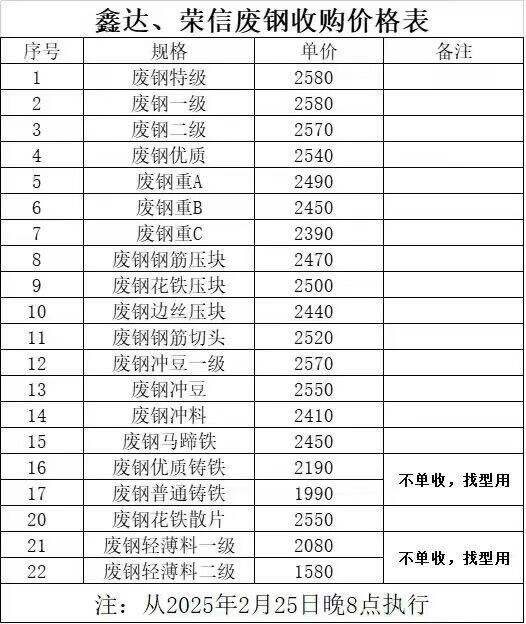 鑫达荣信钢铁废钢于*月**日晚*点进行价格调整,废钢价格下调**,详情见价格表。 送货联系:***********王海亮
