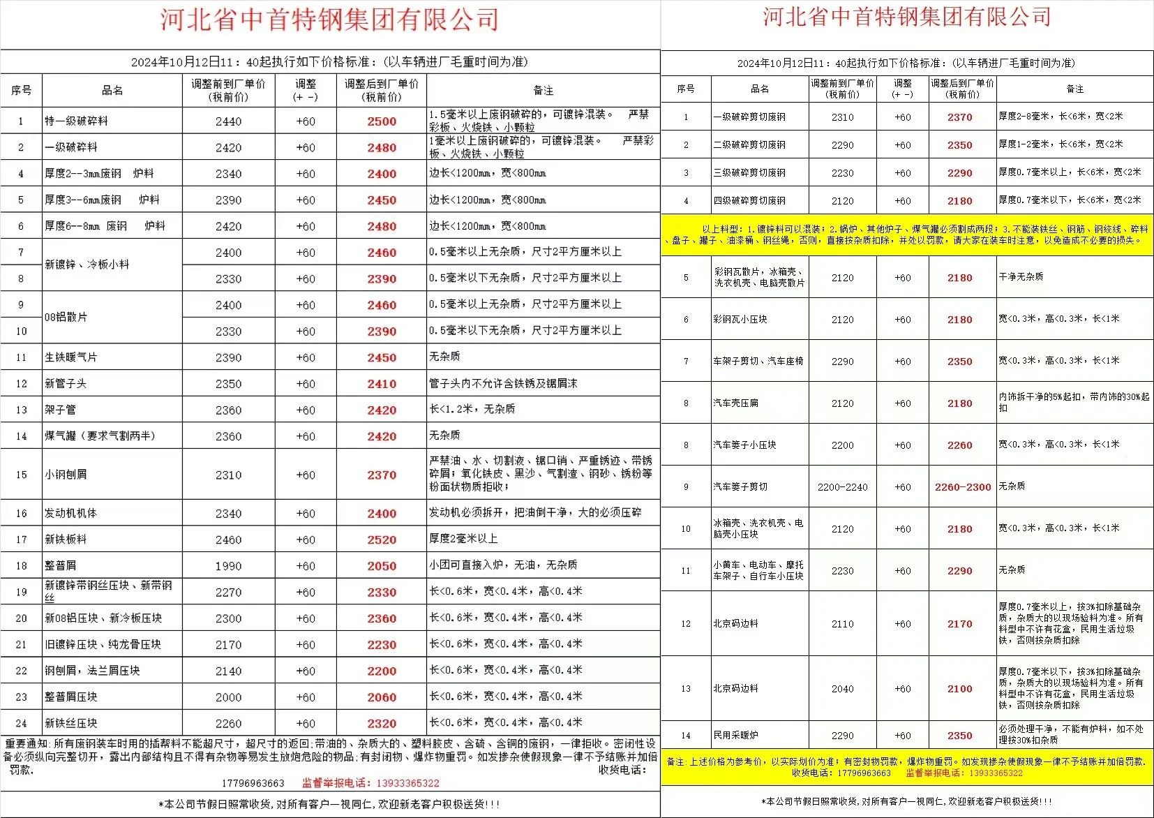 通知,****年**月**日**,**起,中铁门前废钢上调**元,具体以价格表为准!**日沧州中铁最新,优质一级****重A****,钢板滚剪料****,钢板料一级****,钢筋切粒****,钢筋压块****,花铁压块一级****不含税