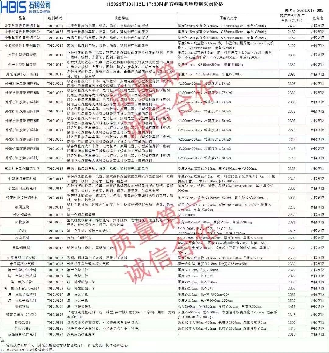 **日宏兴最新,模具钢****,电机轴****,火车轮****,道轨钢****,法兰片、弓子板****,新钢件****,马蹄铁****,钢板料一级****,钢板料二级****,钢板料三级****,优重一****,优重二****,重A****,重B****,重C****,面包生铁****,马蹄铁一级****,马蹄铁二级****,马蹄铁三级****,优碎****,矽钢片****,碎A****,碎B****,碎C****,定子****,新管头****,钢筋切粒一级****,钢筋切粒二级****,滚剪钢筋切粒****,花铁压块一级****,花铁压块二级****,钢筋压块****,边丝压块****,小冷板压块****,小**铝压块****,**铝烤蓝压块****,大钢刨****-****,小钢刨****-****,普销一级****-****,普销二级****-****