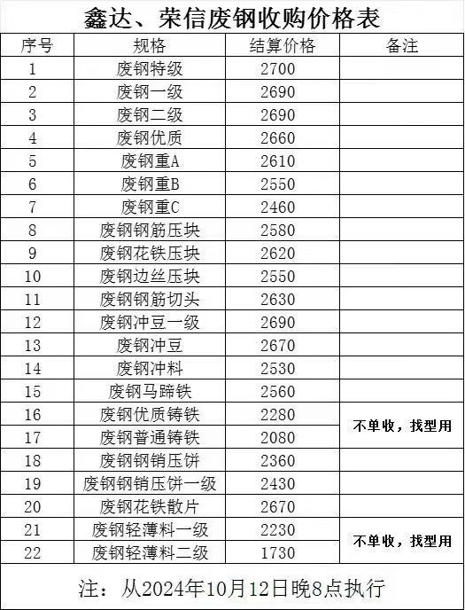 迁安鑫达荣信废钢于**月**日晚*点废钢特级****,废钢一级****,废钢二级****,废钢优质****,废钢重A****,废钢重B****,废钢重C****,废钢钢筋压块****,废钢花铁压块****,废钢边丝压块****,废钢钢筋切头****,废钢冲豆一级****,废钢冲豆****,废钢冲料****,废钢马蹄铁****,废钢优质铸铁****,废钢普通铸铁****,废钢钢销压饼****,废钢钢销压饼一级****,废钢花铁散片****,废钢轻薄料一级****,废钢轻薄料二级****