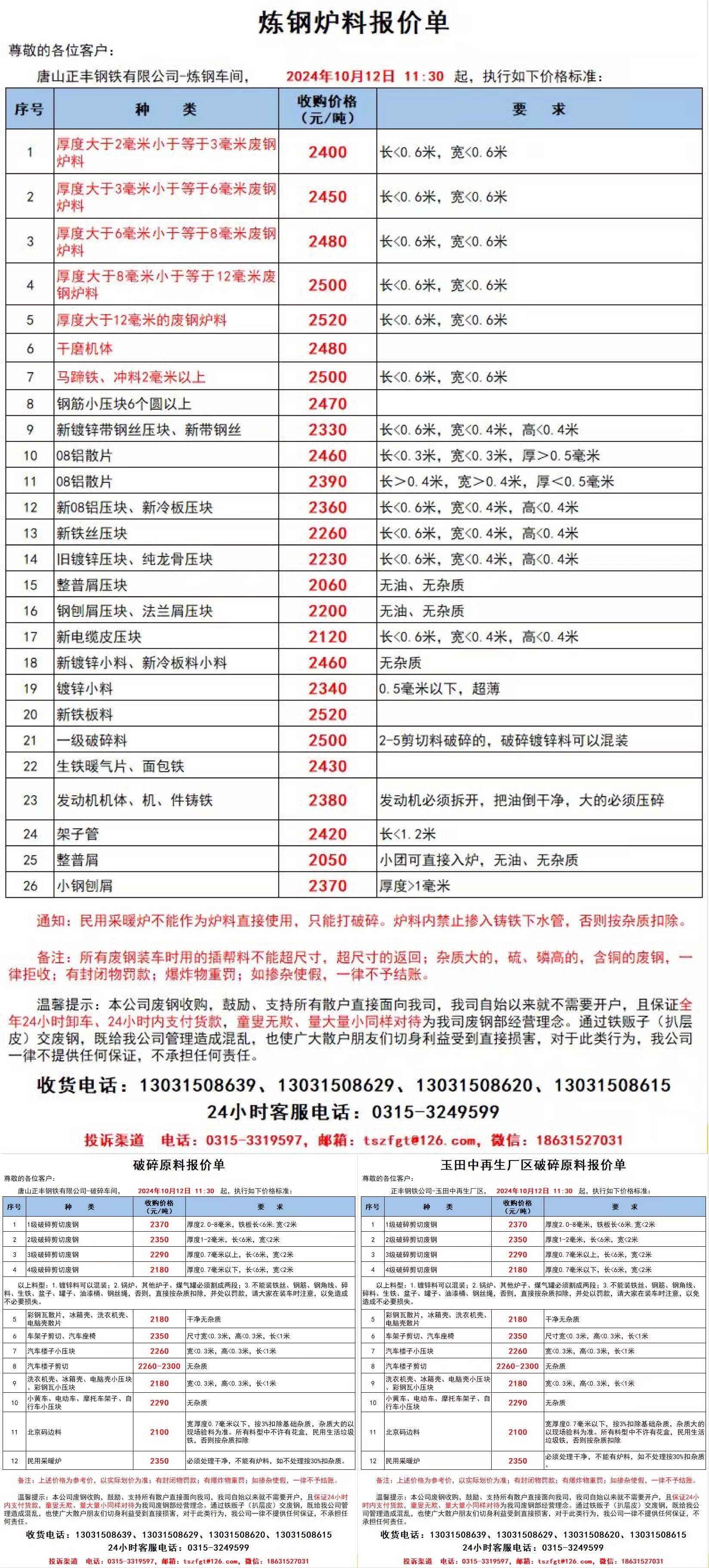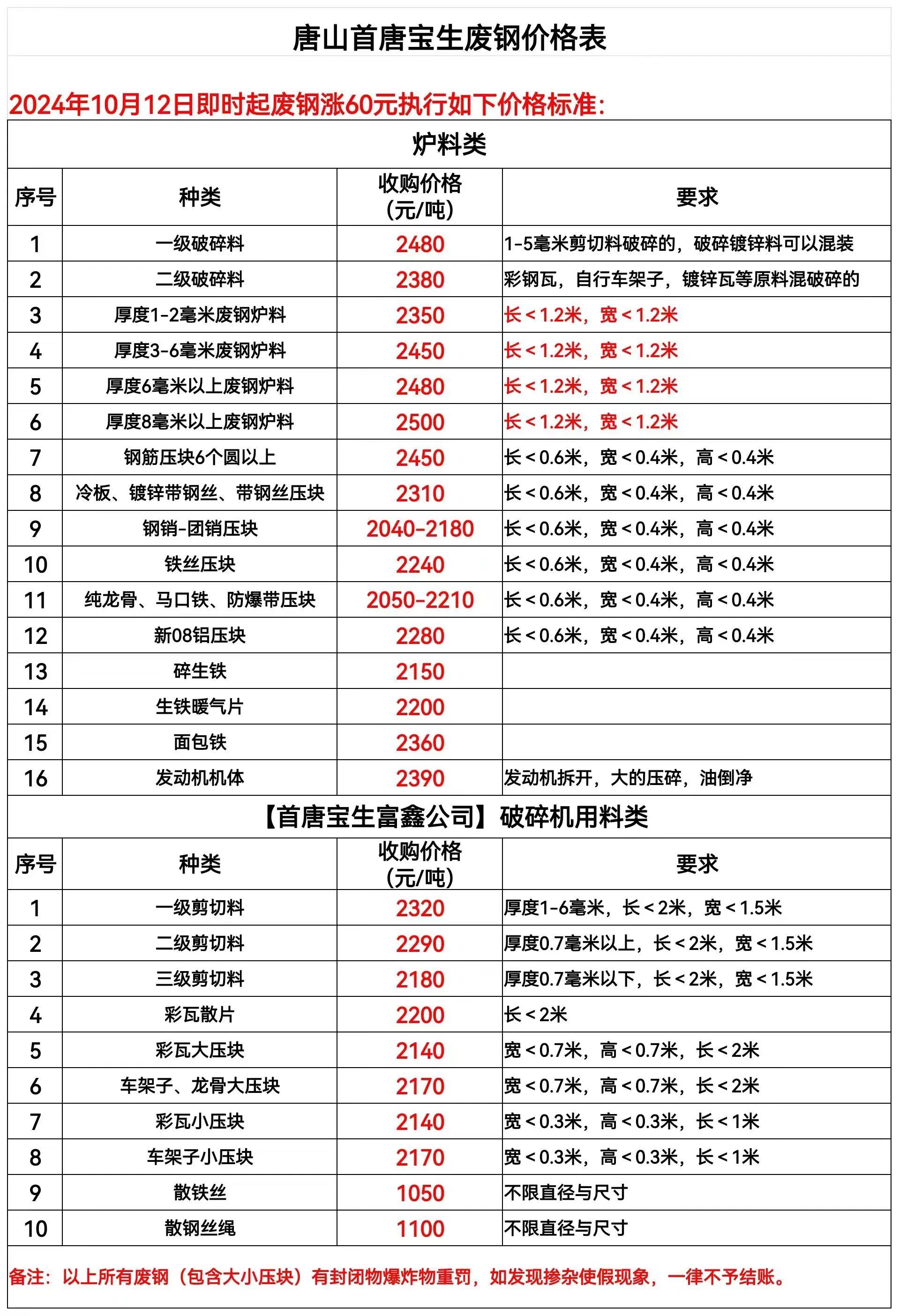 首唐宝生通知,**月**日即时起涨**元,详见价格表,**日首唐宝涨**,一级破碎料****二级破碎料****短尺剪切*-*mm****、*-*mm****、*个以上****、*个上****镀锌带钢丝压块****铁丝压块****生铁暖气片****,一级剪切料****二级剪切料****三-级剪切料****,彩瓦大压块****车架子、龙骨大压块****彩瓦小压块****车架子小压块****散钢丝绳****不含税