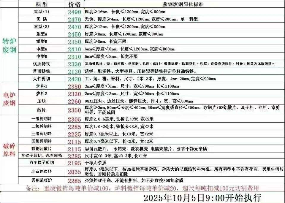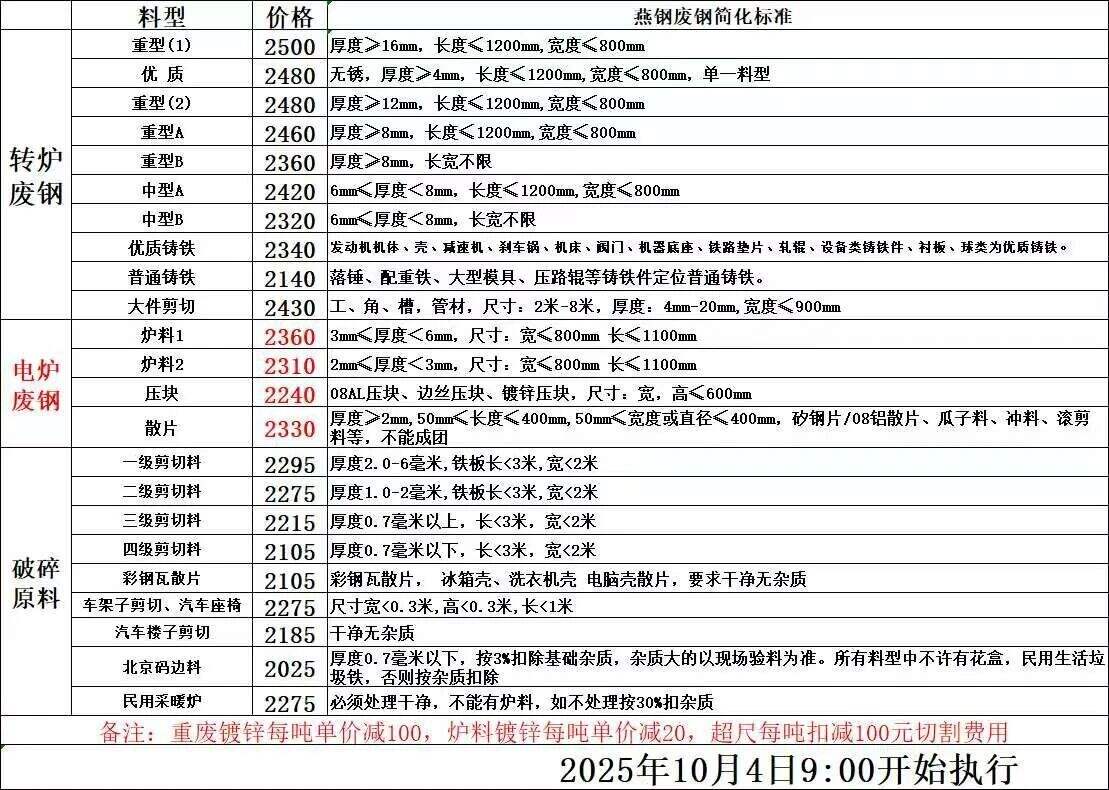 **月*日唐山燕钢废钢价格:重型一****,优质****,重型二****,重A****,重B****,中A****,中B****,优质铸铁****,普通铸铁****,大件剪切****;炉料一****,炉料二****,压块****,散片****;一级剪切料****,二级剪料****,三级剪切料****,不含税。