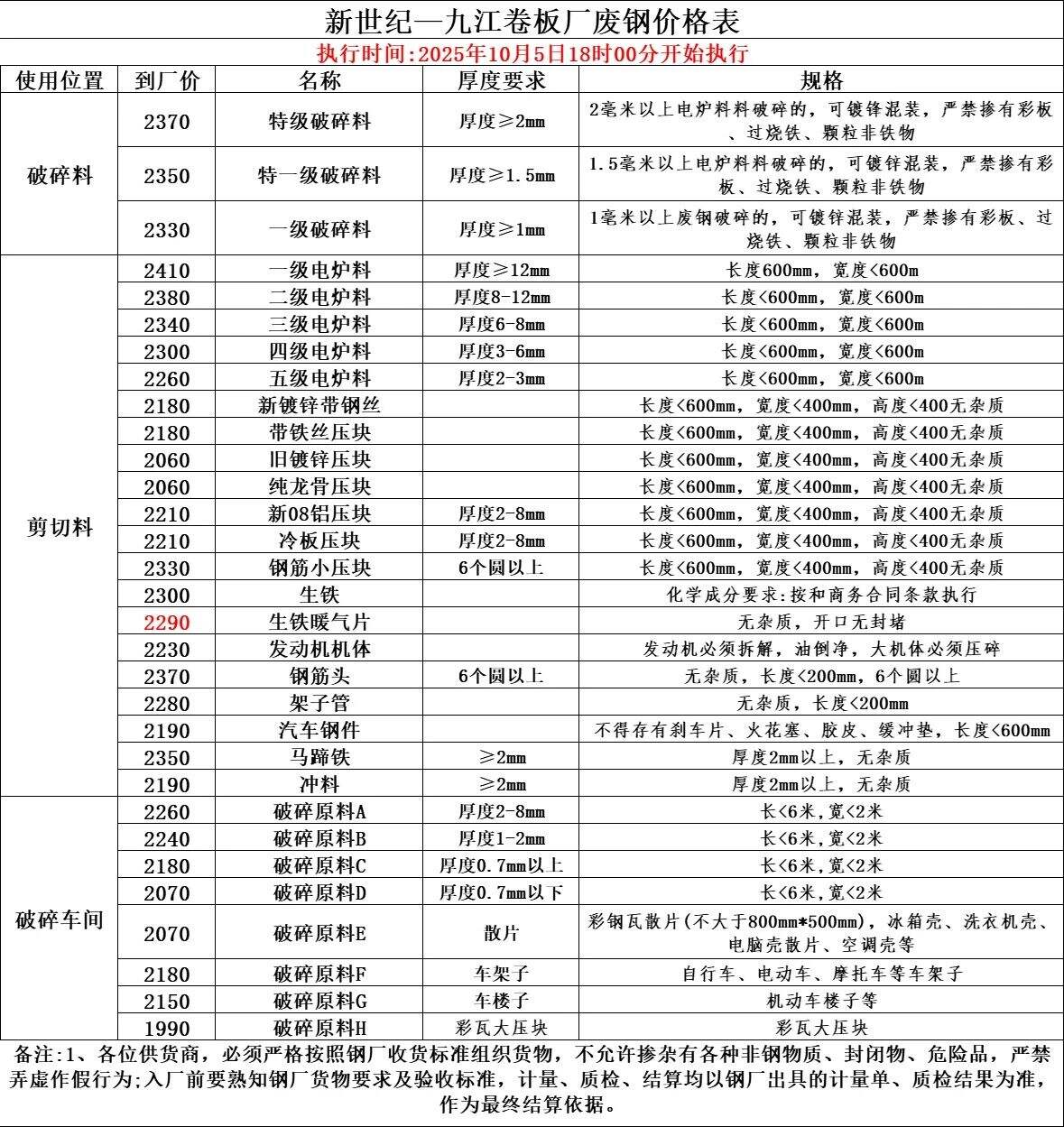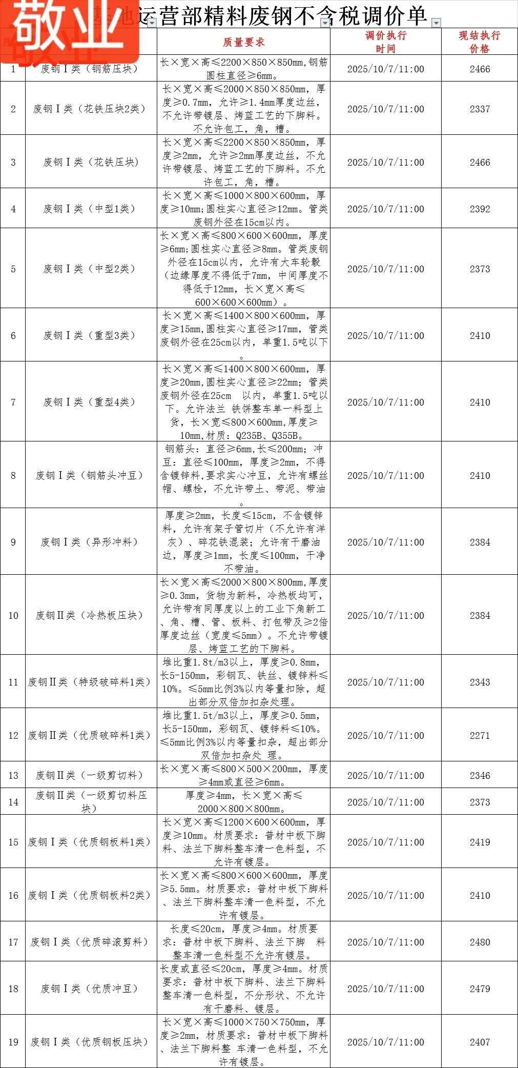 敬业通知:**月*日**点起本部废钢价格调整,具体详见价格表。