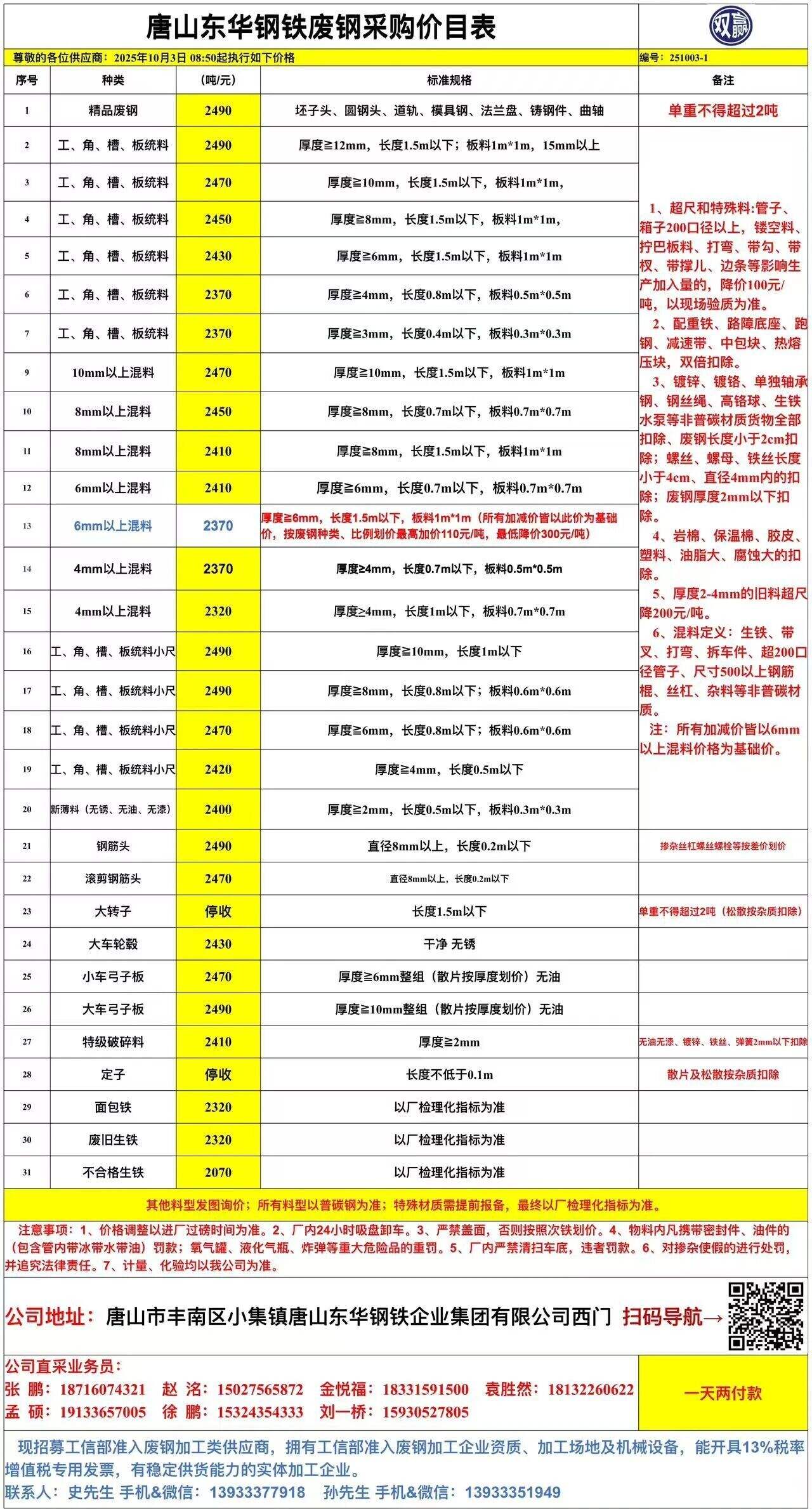 东华废钢采购调价:****年**月*日**:**起,每吨上调**元,以过磅毛重时间为准,详见价目表。