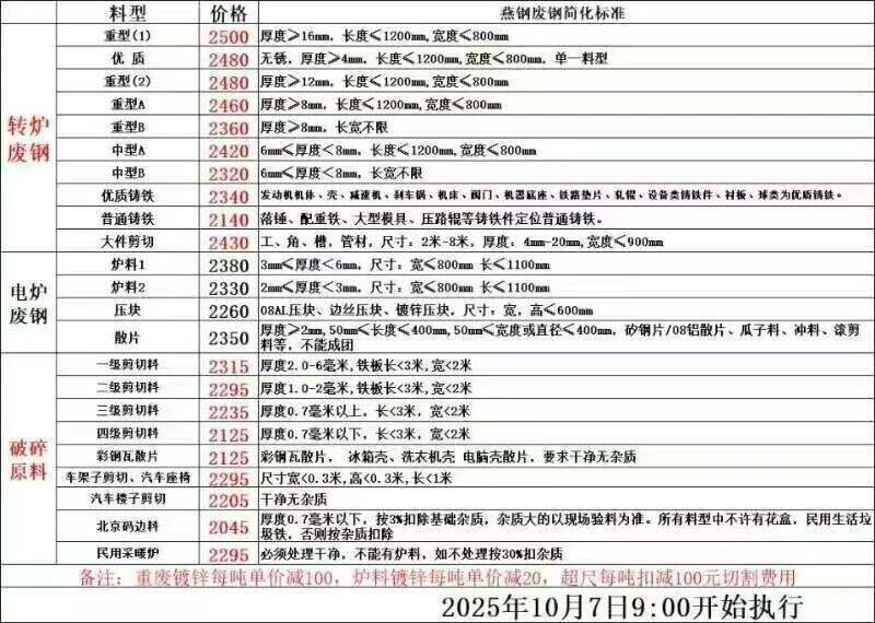 龙安通知,明天早起开始所有料型上调**元,满价****元。龙安通知,满价****元:道轨****、**mm以上重废****、电机轴****、冷板小料(一水*mm)****、手撕钢筋头****