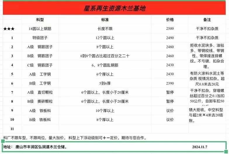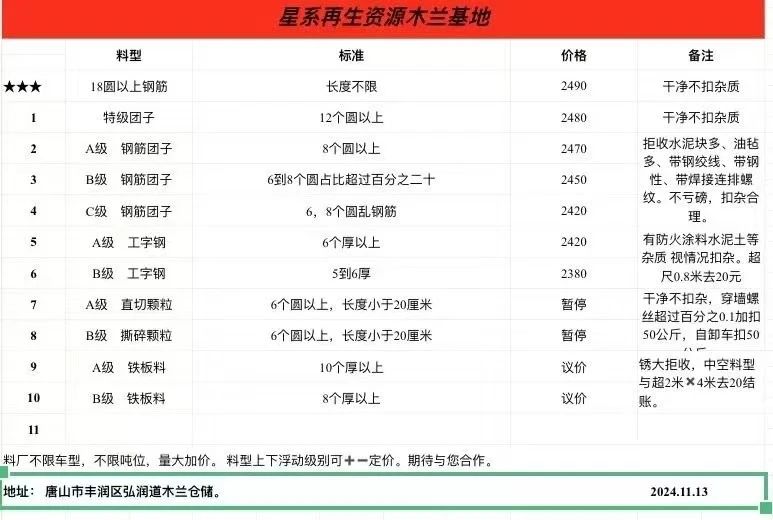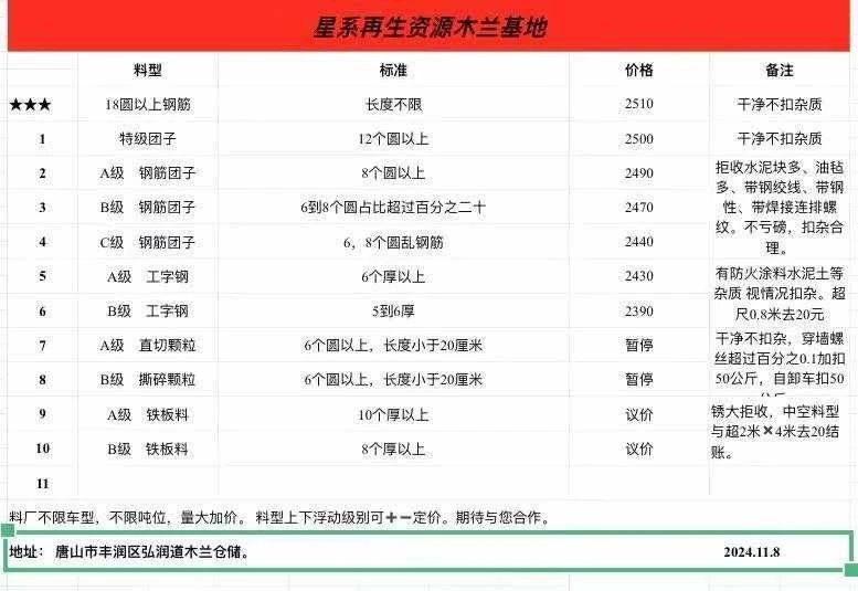 ****年**月**日河北唐山星系再生资源木兰基地报价