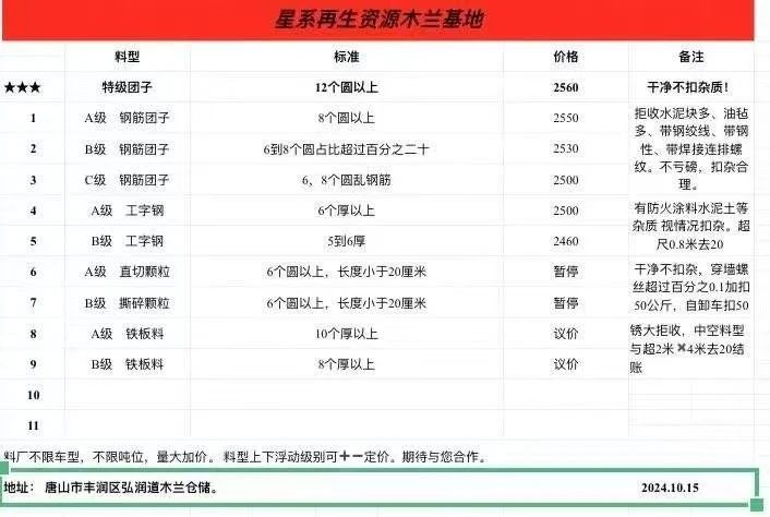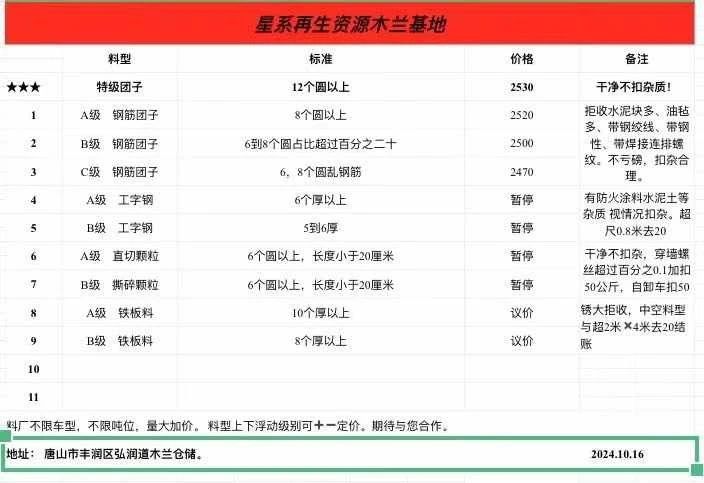 ****年**月**日河北唐山星系再生资源木兰基地报价