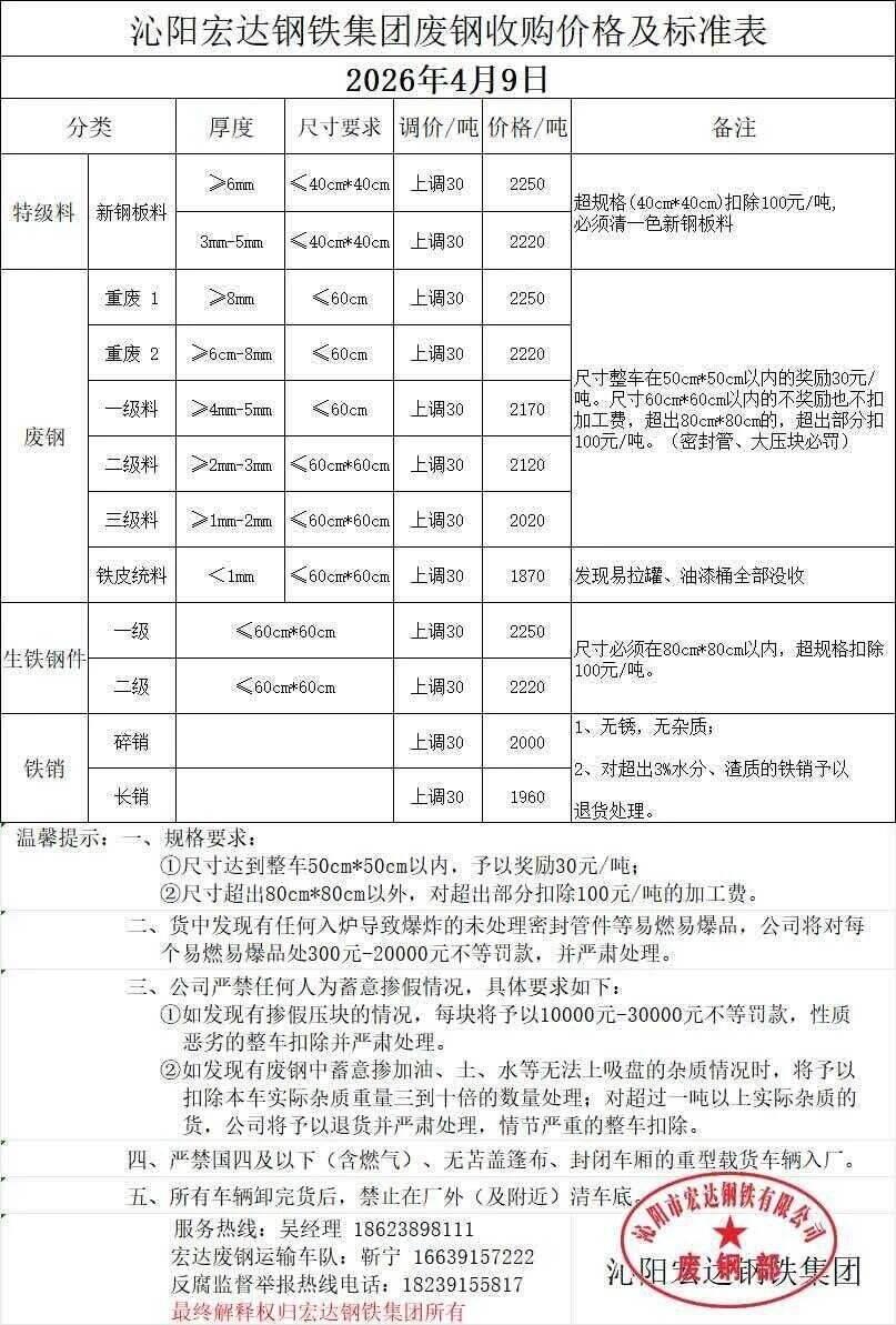 *日沁阳宏达钢铁废钢执行价: