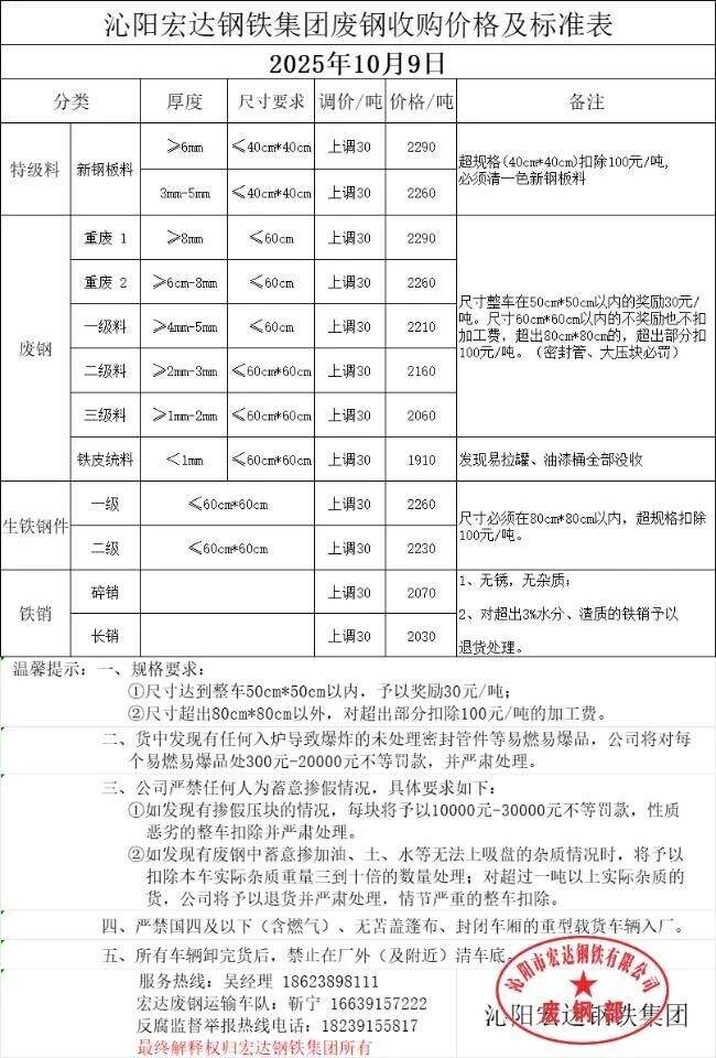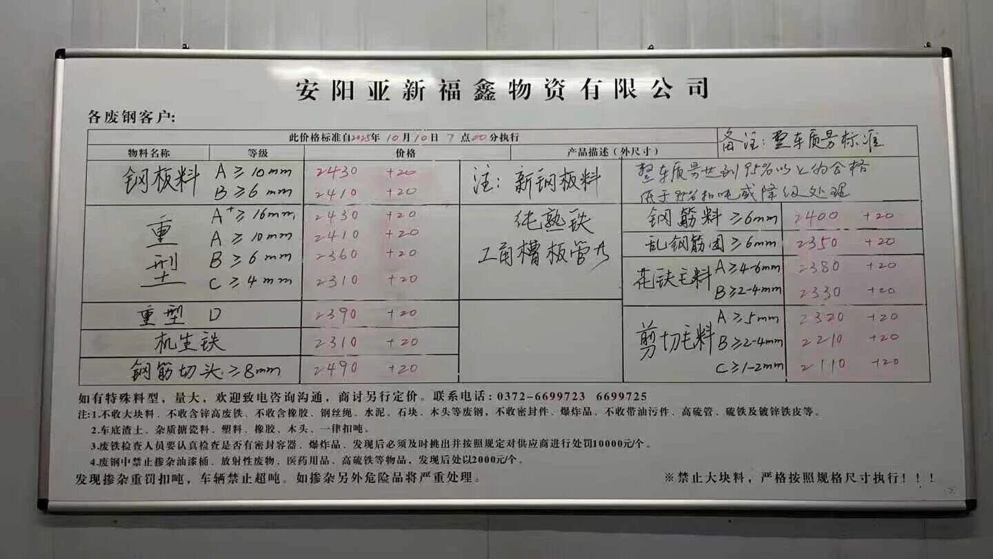 **日安阳亚新废钢跌**:钢板**厚以上****,*厚以上****,特级**厚以上****,重A**厚以上****,重B*厚以上****,重型D****,机生铁****,钢筋切头****,钢筋料****,乱钢筋团****,剪切毛料*厚****,剪切毛料*-*厚****,*-*厚****。(单位:元/吨)