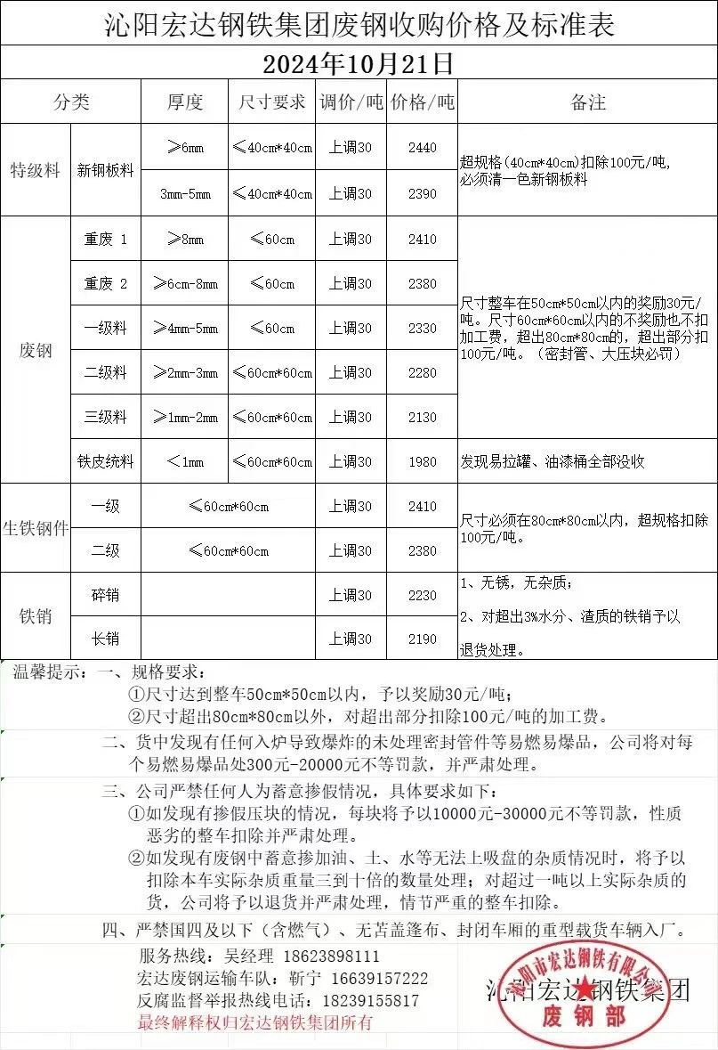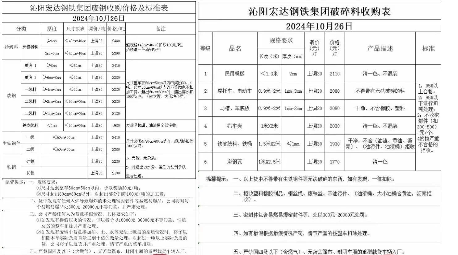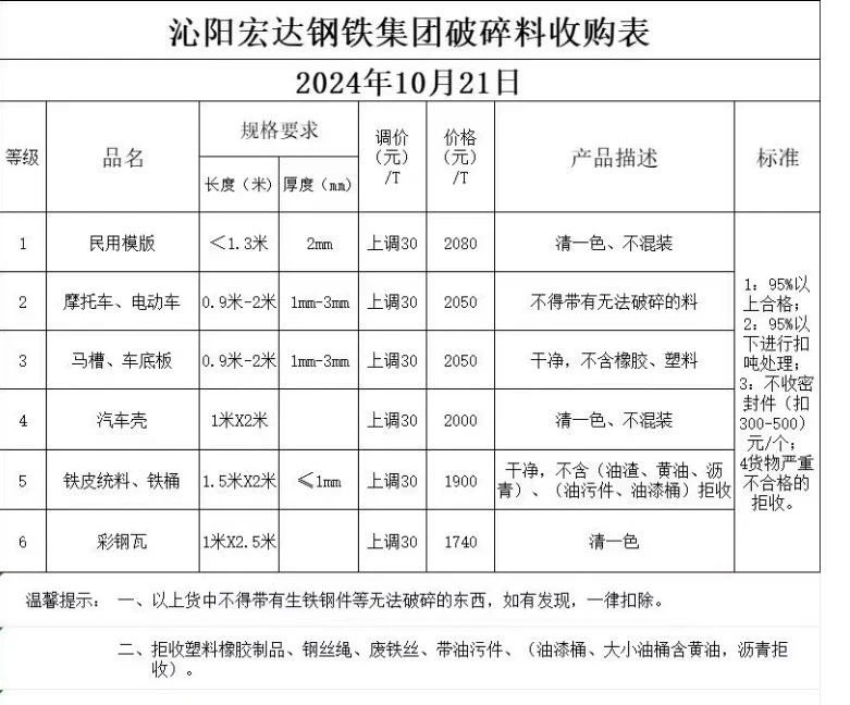 沁阳宏达钢铁集团通知:**月**日上午**点开始,价格统一上调**元/吨,钢板料****-****重废*厚以上****重废*-*厚****一级料****二级料****三-级料****铁皮统料****一级生铁钢件****二级生铁钢件****碎销****长销****