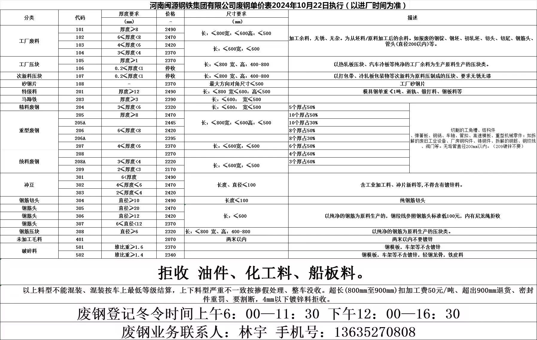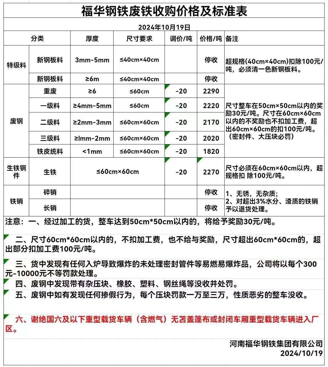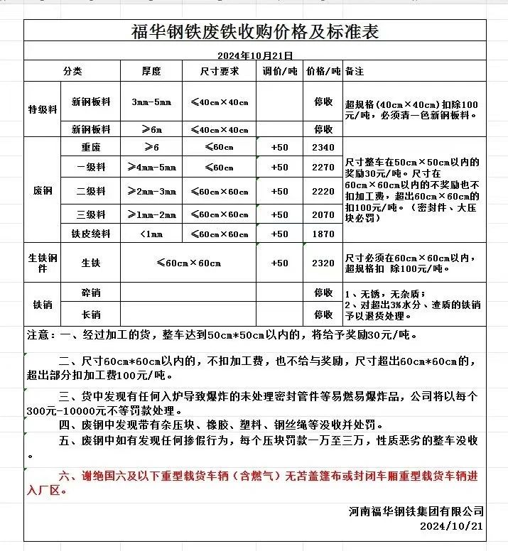 **日郑州福华涨**:重废****一级料****二级料****三级料****生铁钢件****碎销停收、长销停收。