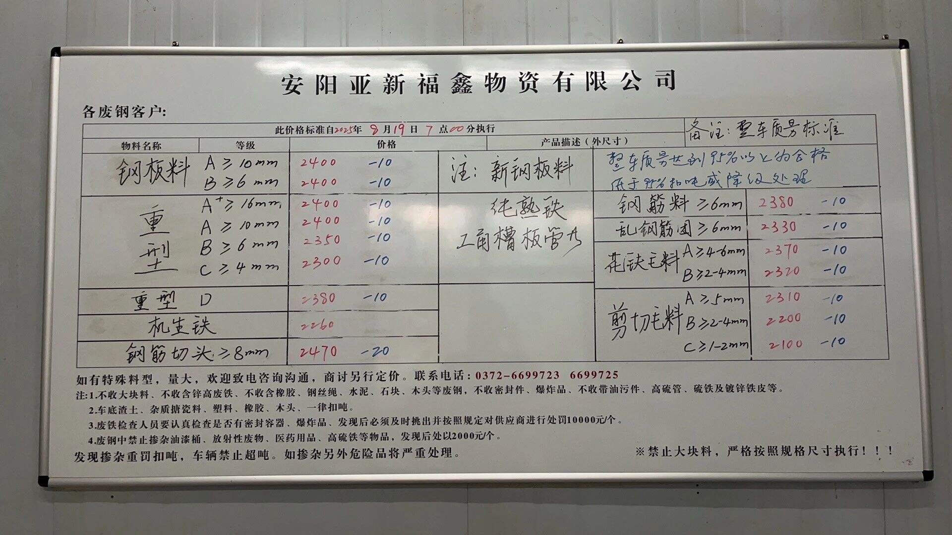**日安阳亚新废钢跌**:钢板**厚以上****,*厚以上****,特级**厚以上****,重A**厚以上****,重B*厚以上****,重型D****,机生铁****,钢筋切头****,钢筋料****,乱钢筋团****,剪切毛料*厚****,剪切毛料*-*厚****,*-*厚****。(单位:元/吨)