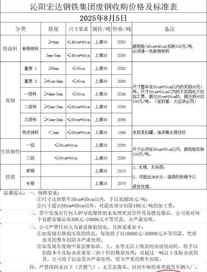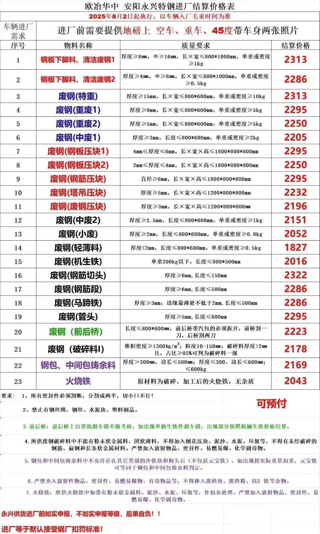 *日安阳永兴特钢废钢跌**,重废一****重废二****清洁废钢****-****中废一****中废二****小废****轻薄料****机件生铁****,钢筋压块****,钢筋切头****以上价格为含**%增值税发票价格,现汇结算。不含税价格见表