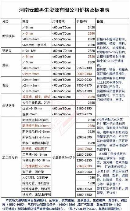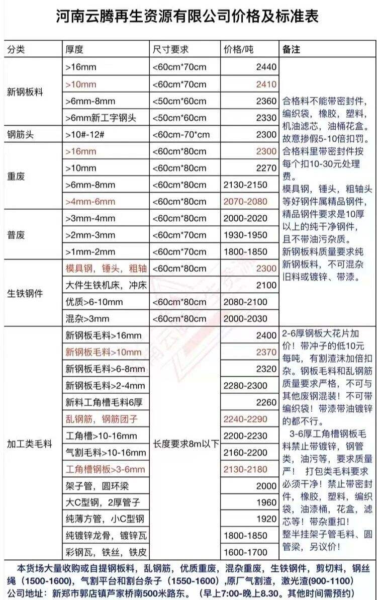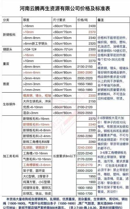 *月*日河南云腾再生资源有限公司价格及标准表: