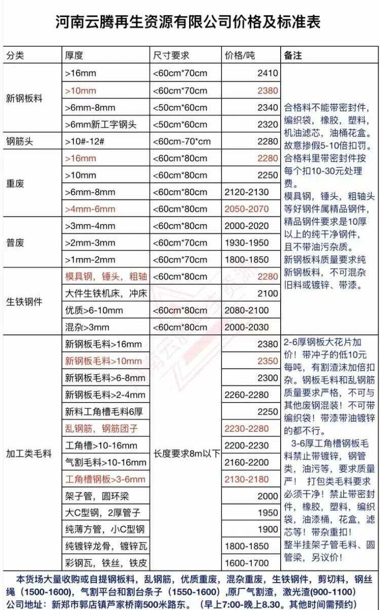 ****年*月*日河南云腾再生资源有限公司价格及标准表