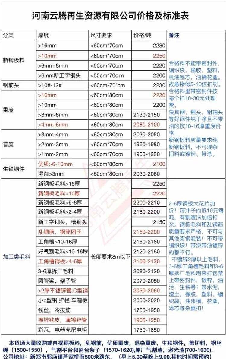 ****年*月**日河南云腾再生资源有限公司价格及标准表
