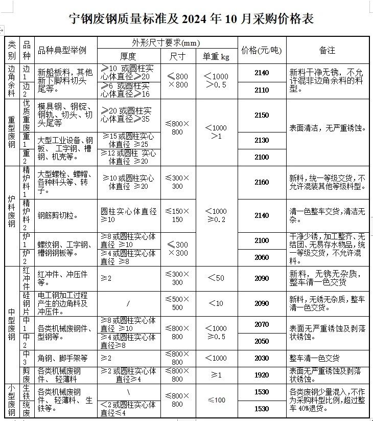宁波钢铁废钢**月采-购最新价,边角料一****重一****重二****炉一****中一****中二****,不含税