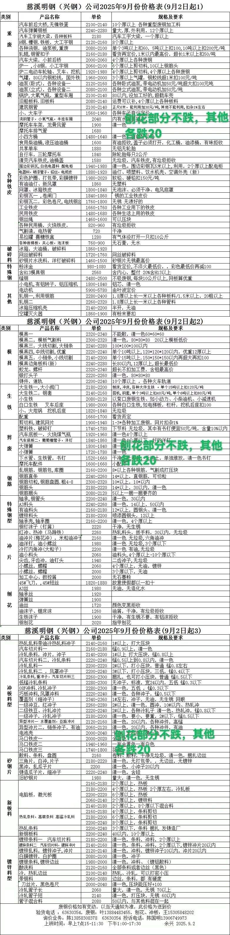 (成.品料:重废,钢板料,杂模****-****/吨,尺寸宽*.*米,长*.*米以内,厚度要求**-**厚以上),(超*.*米以上毛料扣**-***/吨)