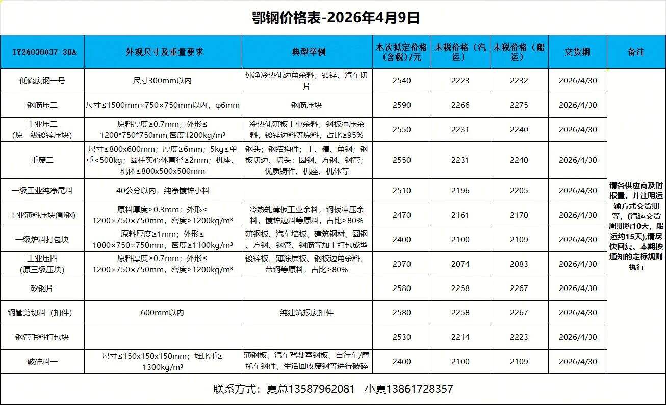 *月*日湖北鄂钢废钢最新价格,执行到*月**日,稍后见表。