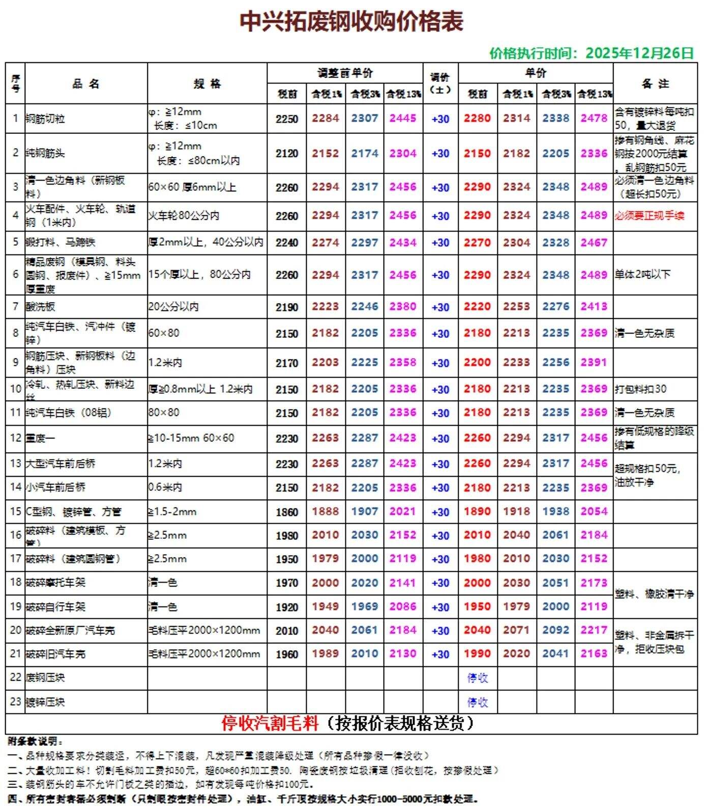统料停收,汽车壳停收,彩钢瓦停收,破碎料停收,铁屑碎屑停收,不含税。