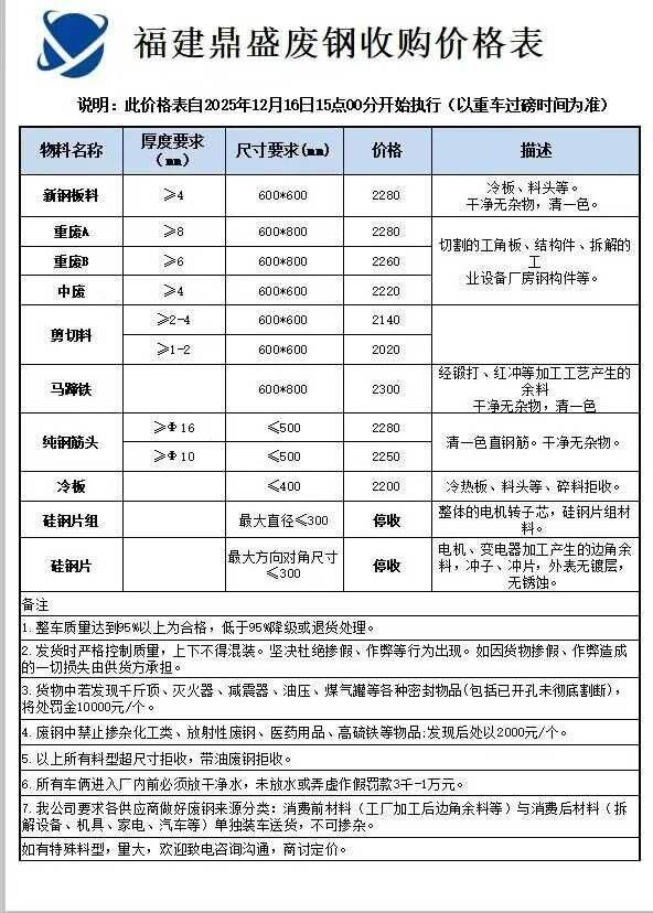 福建龙钢对废钢采购价格下调**元/吨,价格调整从****年**月**日零点开始执行。