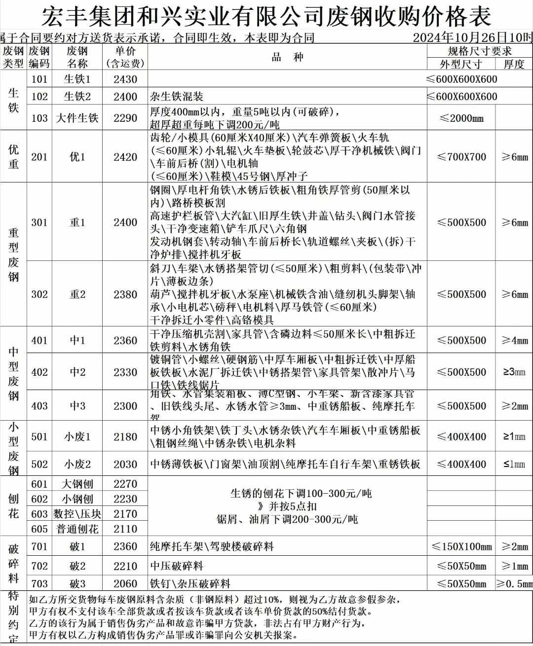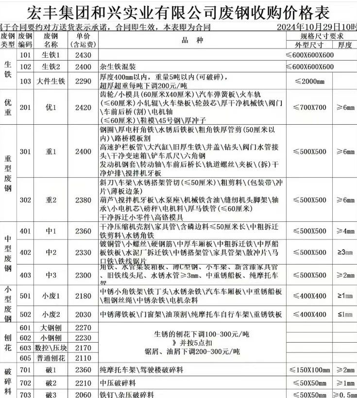 **日宏丰通知:废钢 刨花 破碎料等所有品种统一下调**元/吨,生铁****-****、大件生铁****、优重****、重废****-****、中废****-****、小废****-****、大钢刨****、数控/压块****、普刨****、破碎料****-****