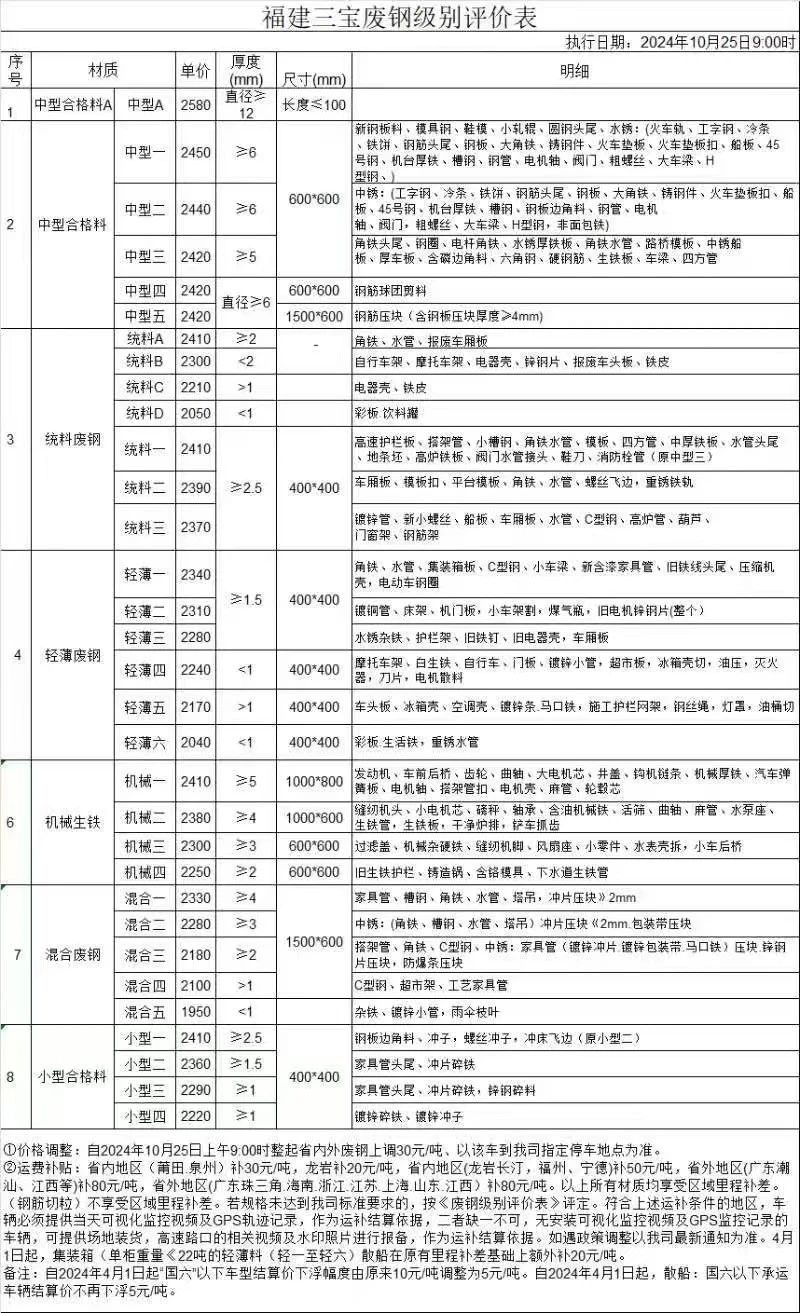 泉州闽光,****年**月**日**时起,省外重一含税价格上调**元/吨,其它等级废钢含税价格上调**元/吨,具体价格详见价格表,省内重一含税价格上调**元/吨,刨花压饼块**元/吨,其它等级废钢含税价格上调**元/吨,具体价格详见价格表